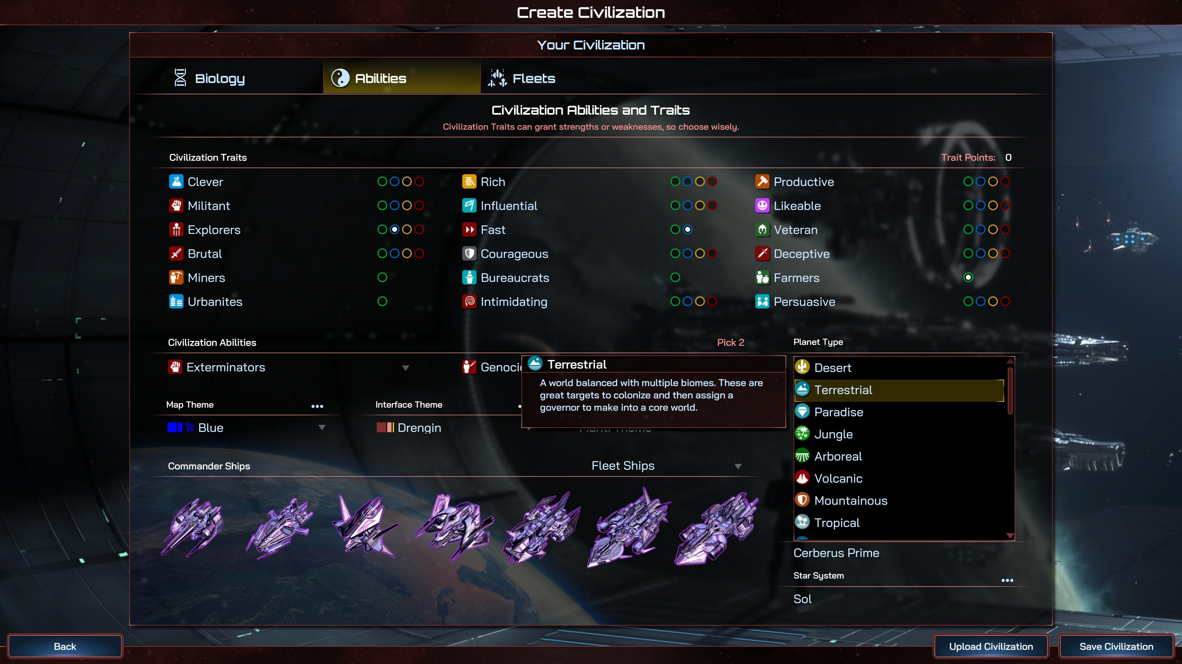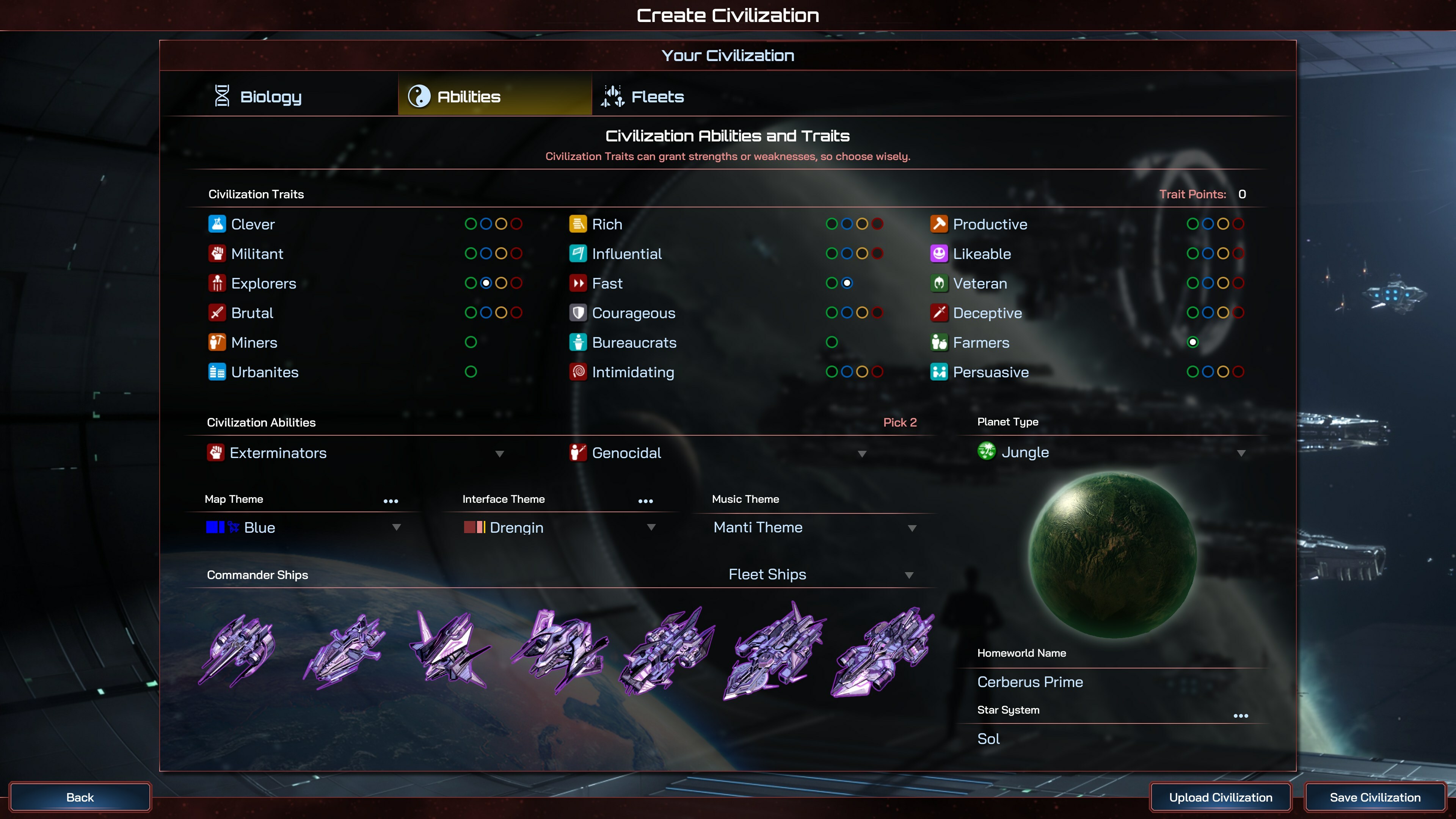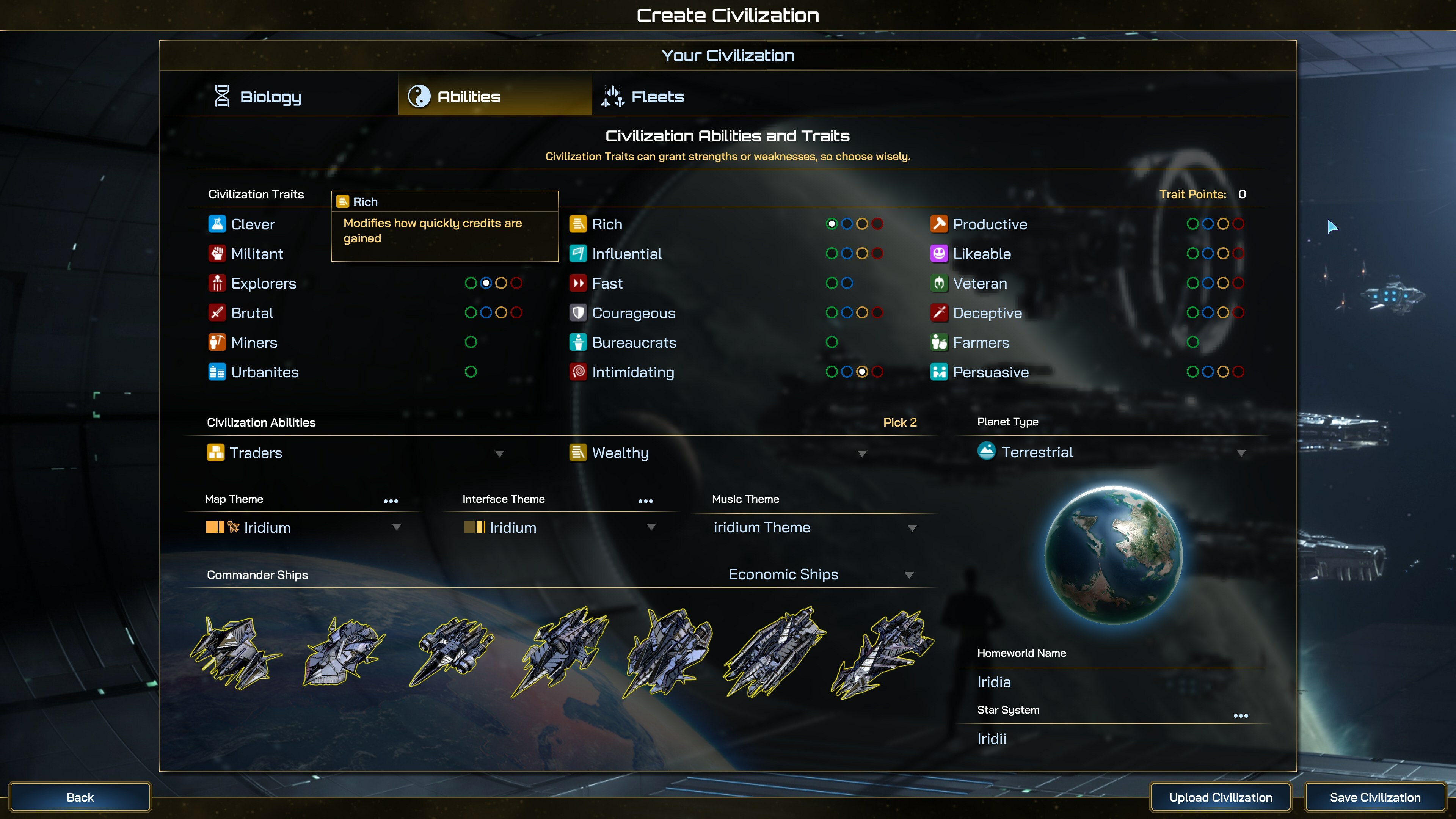 For inspiration, consider existing civilizations like the Corporate Sector. Focused on economics and trade, they maximize the Rich Trait and possess the Traders and Wealthy Abilities, granting bonus trade routes, a wealth of credits, and boosts to gross income and ship range.