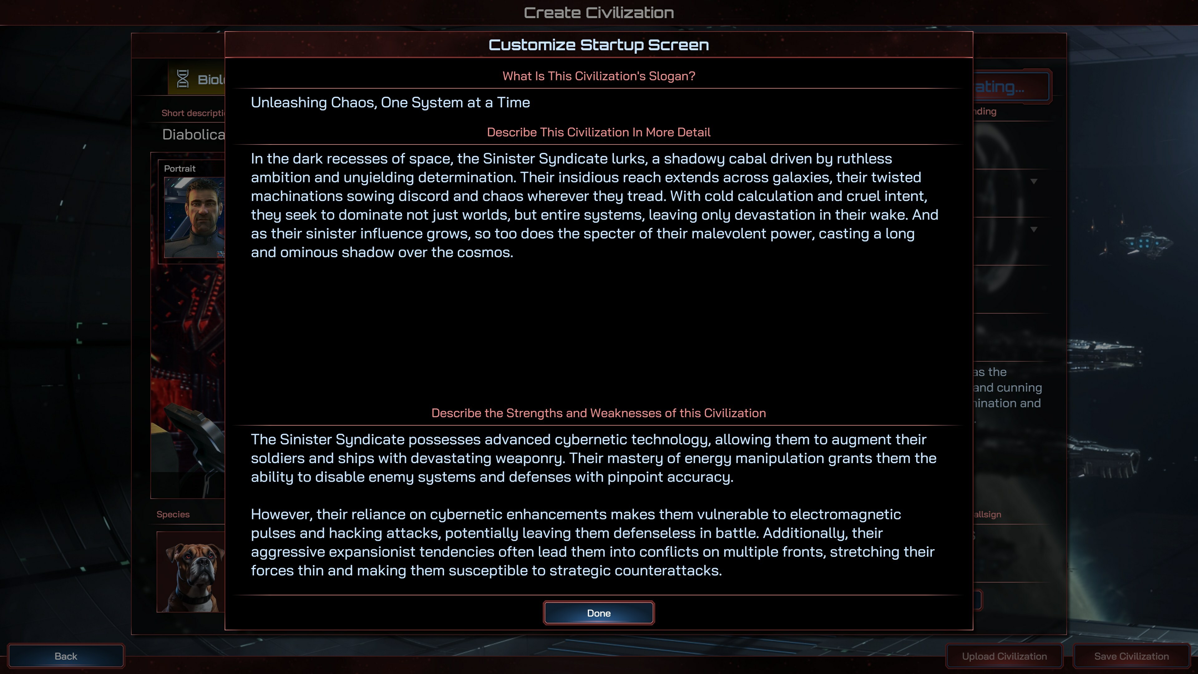 To streamline this process, GalCiv IV features AlienGPT, a handy tool that automatically fills in entries based on a brief description. Any text or settings generated by AlienGPT can be easily adjusted to suit your vision.