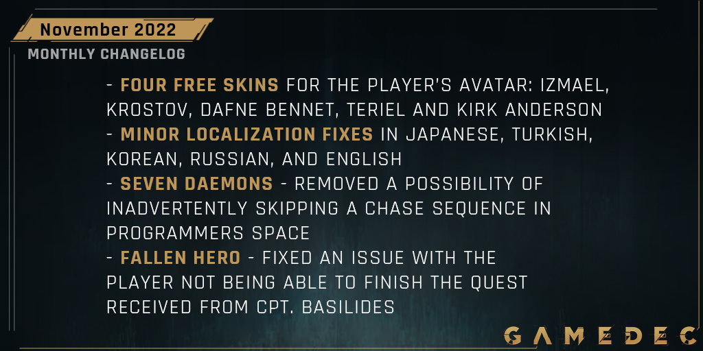 - This update introduces 4 free skins for the Player’s avatar: Izmael Krostov, Dafne Bennet, Teriel, and Kirk Anderson. You can now select to play as a predefined character when starting the new game. Skins are purely cosmetic and won’t alter your gameplay in any way