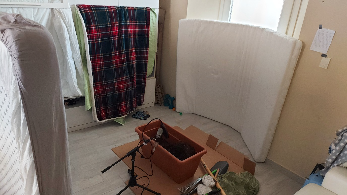 As gardening is the primary activity in the game, and you play from a first person perspective, I started most of my design with a base of realistic sounds that you would expect to hear as you carry out gardening actions in real life – the movement of soil, the scraping and digging of tools, the sploshing of water in a watering can, and so on. The only way to get exactly what we needed for the game was to hit the garden centre and bring home loads of tools, soil, and ornaments to record myself! I set up a makeshift recording room at home, using blankets and mattresses to deaden the echo in the room. I made quite a mess, but luckily managed to clean it all up before anyone got home!