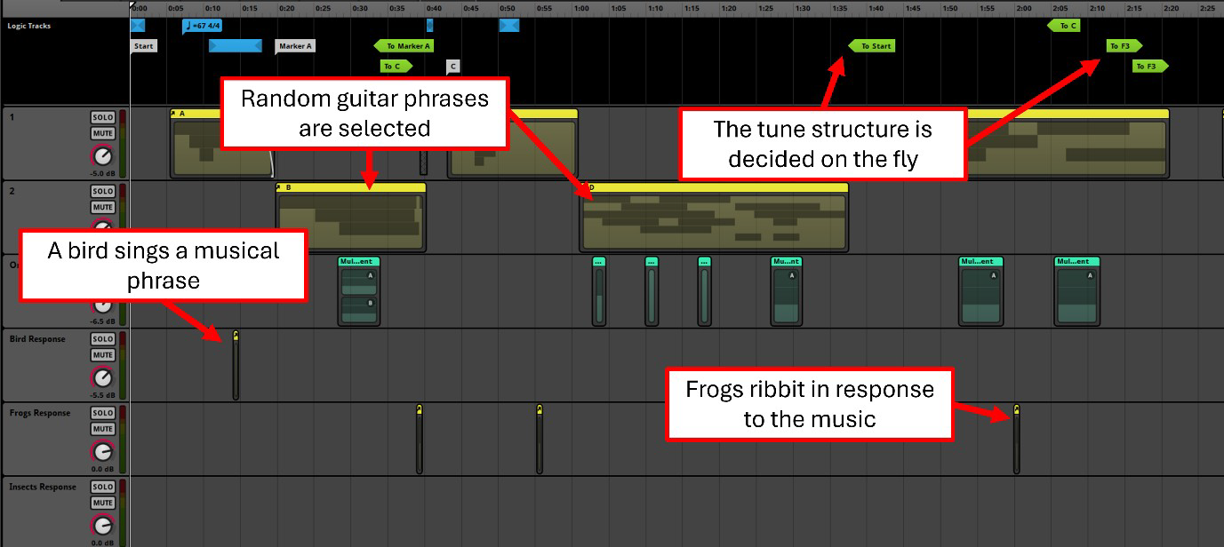 The music that accompanies you in the garden was the very first thing that I came up with for the game, and doing this helped set the right vibe throughout development. From the very beginning, the idea was to have many musical elements that are put together on-the-fly, so the tune never sounds exactly the same twice. And still you could always have an idea of what was coming up next, and follow the tune along in your head. Imagine having a friend sitting in your garden, playing a tune, but occasionally playing it a slightly different way – that’s the kind of relaxed vibe we wanted. To do this, I recorded loads of variations of guitar riffs, piano lines, ukulele parts, percussion measures… and stitched it all together in audio software called FMOD. Under the hood, this allows all sorts of real-time magic, like enabling different parts of music based on the time of day, weather, or at random. And disabling other parts completely. Making the music different with every playthrough.