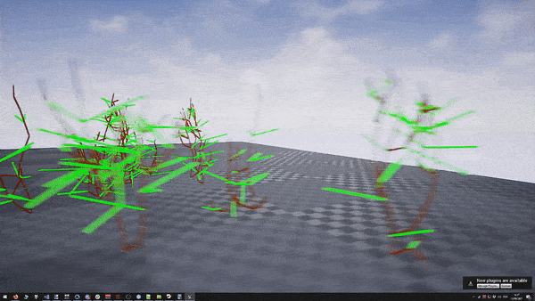 Looking at above growth animation it becomes clear our flowers are not static 3D models. Every flower model is generated on-the-fly. Follow the algorithm / recipe: - It starts in the ground, where the first stem segment is generated and grows. - When the segment is finished, a new segment is spawned. - The growth direction for the new segment gets a kick in a random direction so the stem does not grow in a straight line. - At every new segment and depending on the flower, there is a random chance that a leaf grows out of the stem. Or the stem splits up into 2 segments. - The more segments the plant spawns, the bigger the chance to produce the final flower at the top, finishing the growth process. - Depending on the flower type, the top gets another kick in a random direction for good measure. This simple recipe allows for so much variation and produces organic, beautifully looking flower beds. Every flower has leaves at different places. Some stems are shorter, some longer, with random variations in growth direction here and there.
