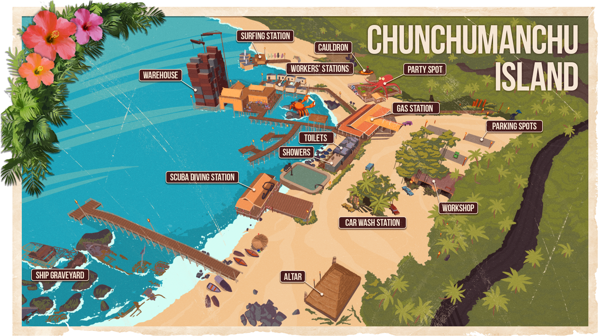 Okay, let's get back to the main point of today's devlog. Most of you have probably seen how the station is gonna look like. The question is whether you're aware where to find specific buildings such as Car Wash, Gas Station, and Warehouse let's say. The good news is that our 2D graphic designer did a terrific job and has prepared this practical "Resort Map" as we like to call it for your reference. From now on, no excuses that you got lost on the island...