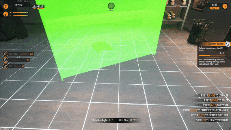 Welcome to another Gas Station Simulator update. Recently we’ve shed some light about the long-awaited Shady Deals DLC, so if you would like to dive into the details, you can check it out by clicking [url=https://store.steampowered.com/news/app/1149620/view/4065130635420574849]this link[/url]. Today, I’ve got some exciting stuff to share – the much-anticipated “Snap to Grid” feature is right now available for you, which means customizing your station will become much, much easier and more precise from now on. With a snap to grid you can adjust the angle of rotation and a grid size. Check the gifs below to see how it looks in the game.