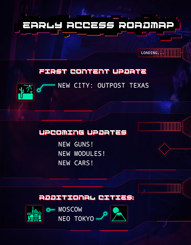 - Four different cities, from the desert remains of the USA to cyberpunk Soviet Russia in a post-nuclear winter (New Baltia at Early Access launch, Outpost Texas 3 to 4 weeks post-launch, and two more to come!)