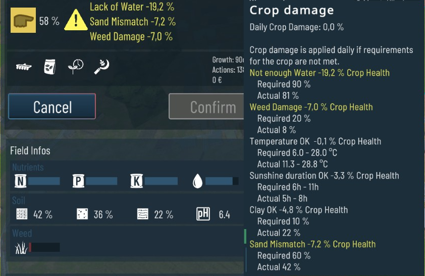 - Crop requirements damage info now shows if temperature or sunshine duration is too high or too low, such distinctions were missing before, reworked tooltip in general.