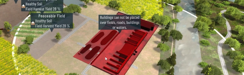 New construction menu for the map view: Place new buildings near fields to boost their productivity.