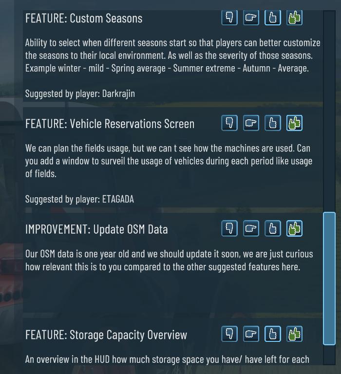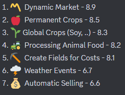 Besides ensuring playability and technical stability, we are currently evaluating how we can add meaningful progression, content and something to keep you motivated to play more global farmer as we see this as the biggest issue at the moment. There were some great suggestions from our community so far regarding general feature ideas and feedback and we going through them carefully and adding them to the feature request board in the game from time to time. These are the current rankings of your votes and we are analyzing what we should do first and how.