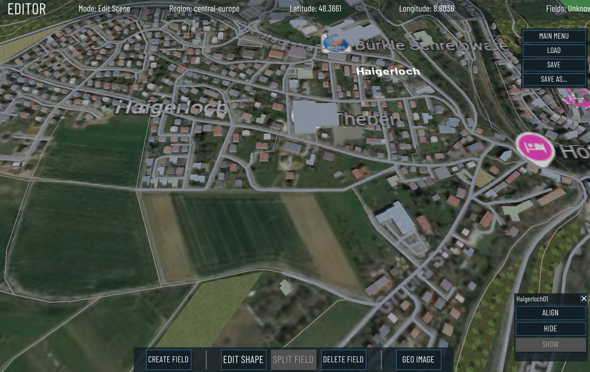 If you want to draw the actual fields close to your hometown you can use the editors GEO image feature. - Load your location in the map editor - Make a screenshot of your hometown in google maps or any other map viewer - Make sure the screenshot is roughly the size of the map regarding how far you zoomed in - Save the screenshot to your PC - Press the GEO Image button in the map editor - It lets you select your file - Follow the steps - The texture gets overlayed on the map - Find good visual indicators on the loaded map and the texture, like houses, street crossings - You will then select those visual markers trying to match both maps - This will rotate and scale the loaded texture to perfectly align with your map - Start creating fields If it all goes right it can look like this: