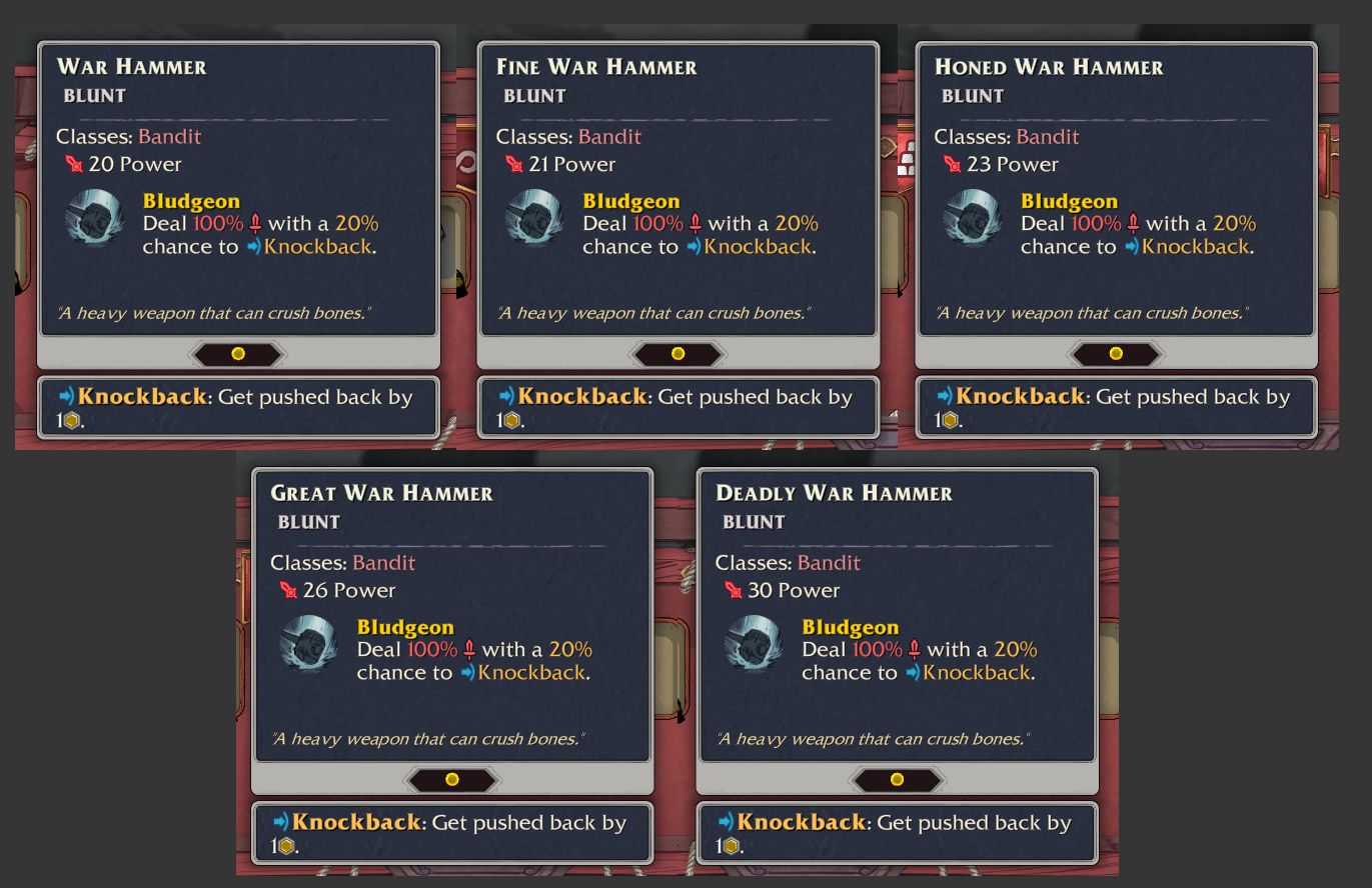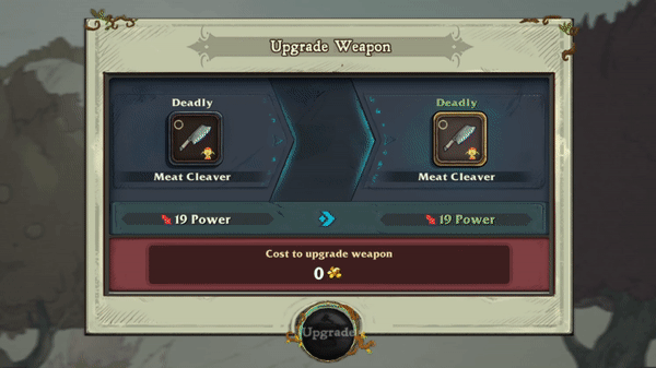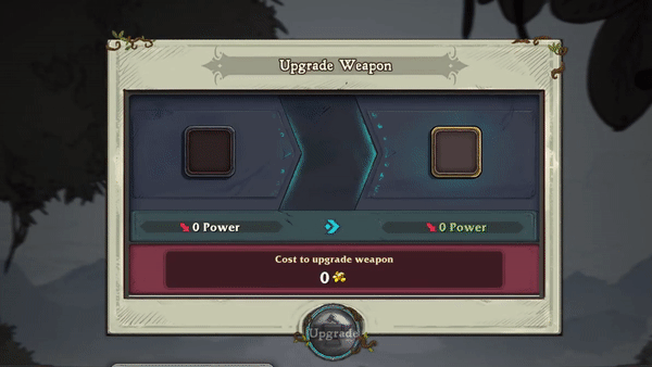 Interacting with the Smithy will prompt you to select any weapon to enhance it. Upgrading a single weapon costs gold and increases by 30 gold with each subsequent attempt. While it is possible to encounter the Smithy early in the run before you can gain gold in the level, we made sure that you can still gain value from every encounter as the first upgrade is always free.