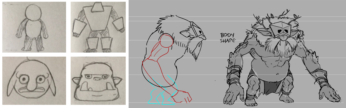 Now, let’s talk about the Trolls. Despite being the largest creature (even bigger than the Orcs) in the Goblin Stone world, Trolls are known for their shy and gentle nature. Our initial idea for the Trolls is to give them a massive masked head decorated with natural elements like twigs and vines. We created the Trolls with triangular bodies and heads, similar to how Goblins have rounded heads and Orcs have trapezoid-shaped bodies.