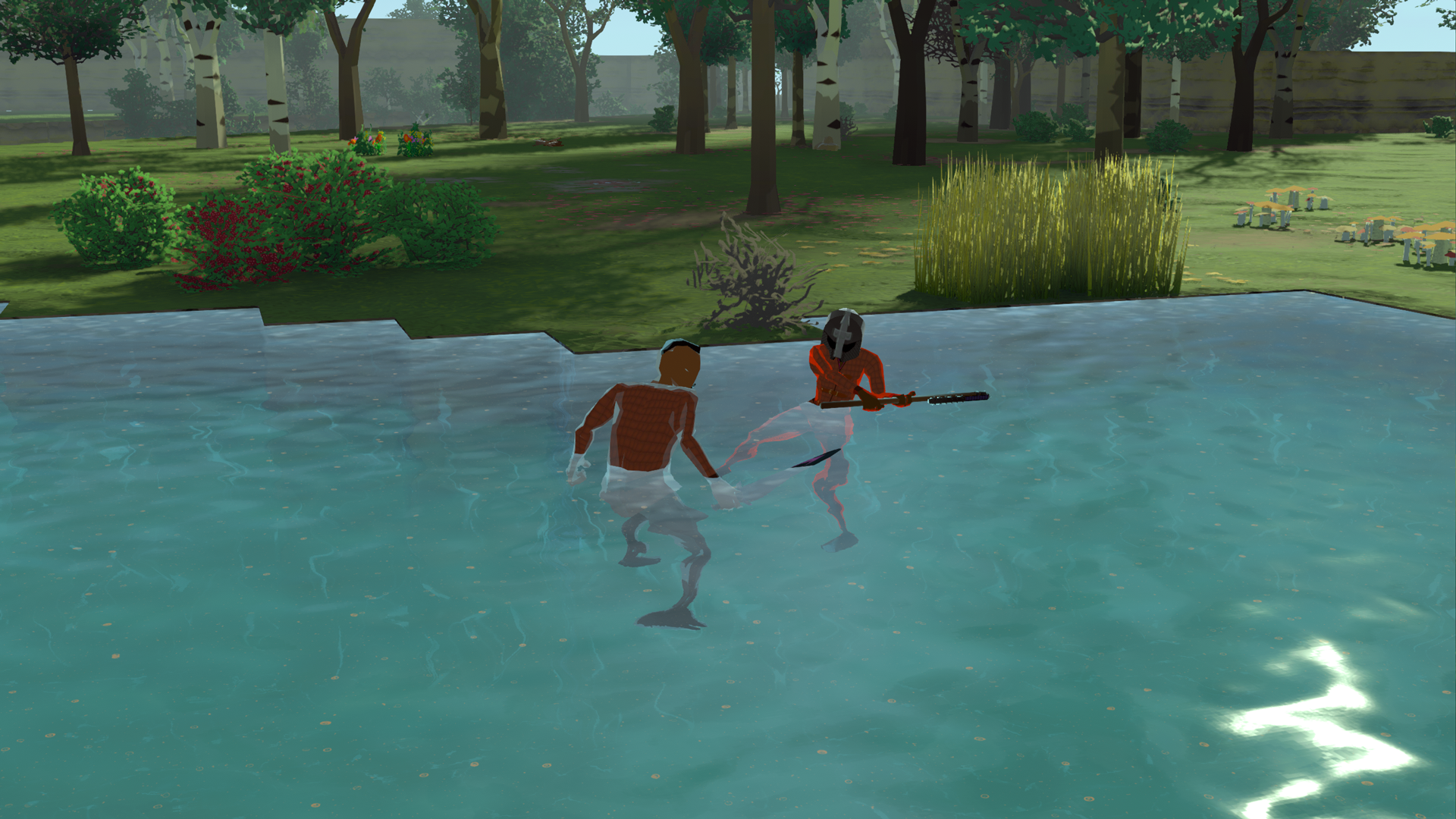 Humans follow similar logic as animals but with additional options. They can walk on shallow water, but they can also build on it, play games, eat, pick stuff and cut trees and plants (that can grow on such depth). Low depth allows them to just swim and pick stuff up. In this depth they can swim beneath floors that are positioned on a level above them, but they can’t climb onto it. Deep water allows them just to swim, but they can climb onto surfaces and floors of the same level.