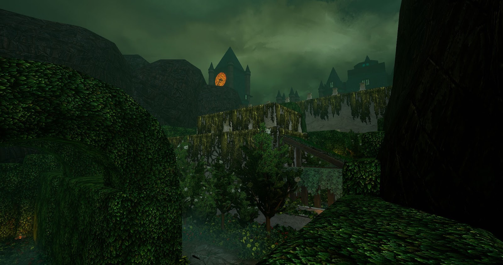 A vertical climb through a thick, hedge maze garden connects the Clotted Avenues and the Cruxfirth Archives (library). This allows us to have the Archives on a higher elevation so the clock tower is an almost always visible landmark. The hedge maze itself organically creeped into the archives. The player can then unlock a shortcut back to the town of Cruxfirth via a gated off tavern.