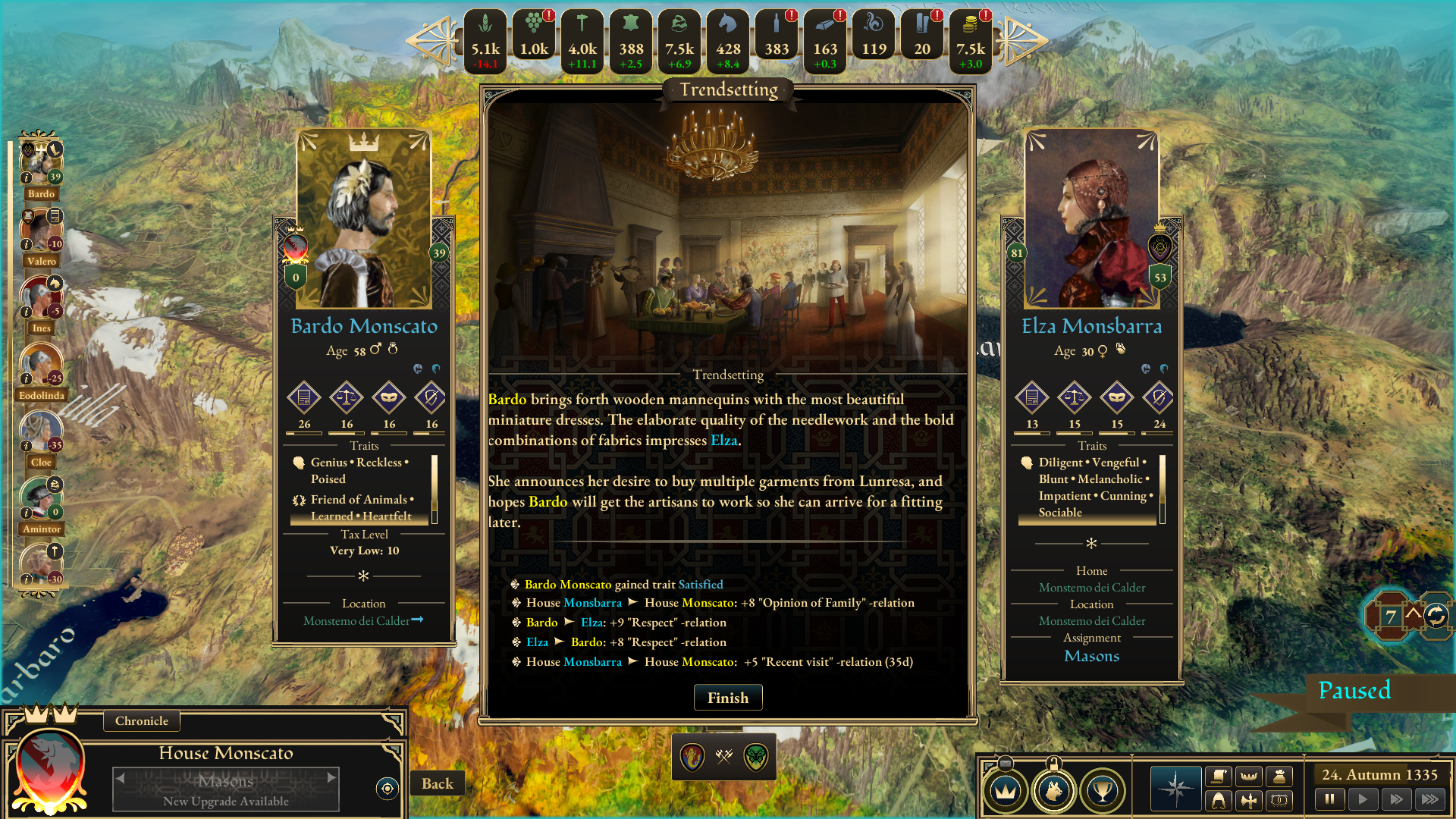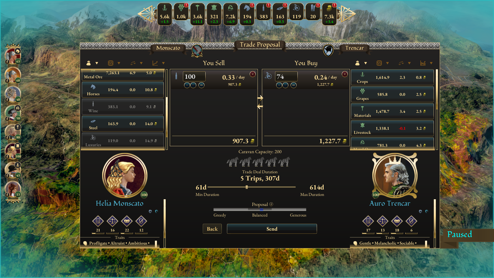 In most events, whether diplomatic or trade-focused, [b]relations between participants play a pivotal role[/b]. [b]House relations[/b], in addition to [b]personal relationships[/b], [b]can influence outcomes[/b]. Some actions, like declaring [b]war[/b], [b]require extremely negative House relations[/b]. Your Head of House must have bad relations with the Head of the House you want to start a war against. When it comes to [b]trade[/b], it isn't simply an economic activity in Calderia; it's a [b]diplomatic tool and lever[/b]. [b]Trading can improve or deteriorate relations[/b] between Houses. Fair deals foster goodwill, while exploiting others can strain relations. It's a nuanced system where every trade decision has consequences beyond material gains.