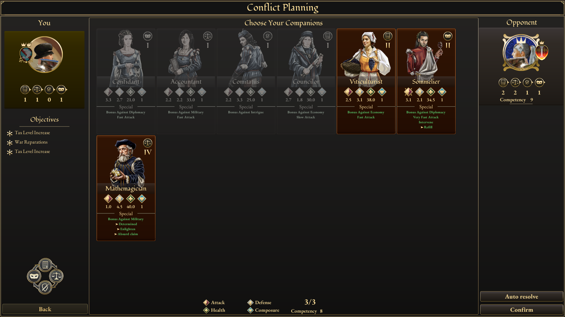 [b]Family member characteristics and abilities[/b] Each family member possesses [b]basic stats[/b] like "[b]attack[/b]" and [b]health[/b], influencing their strengths in negotiations. Additionally, [b]personality traits[/b] grant them extra abilities, some passive and others active. These abilities, ranging from automatic impacts to temporary boosts, significantly affect conflict dynamics and make your family member a determining part of the negotiation. [b]Role of companions[/b] Companions, representing the [b]household staf[/b]f, are useful assets in social conflicts. They are unlocked through [b]fiefdom upgrades[/b] and accompany family members in negotiations. When starting a negotiation, you will have to choose which ones will take part in the social conflict. Higher-tier companions possess stronger abilities, better health, and "attack" values. They are all [b]specialized[/b] in one of the four following skills: Diplomacy, Economy, Intrigue, or Military.