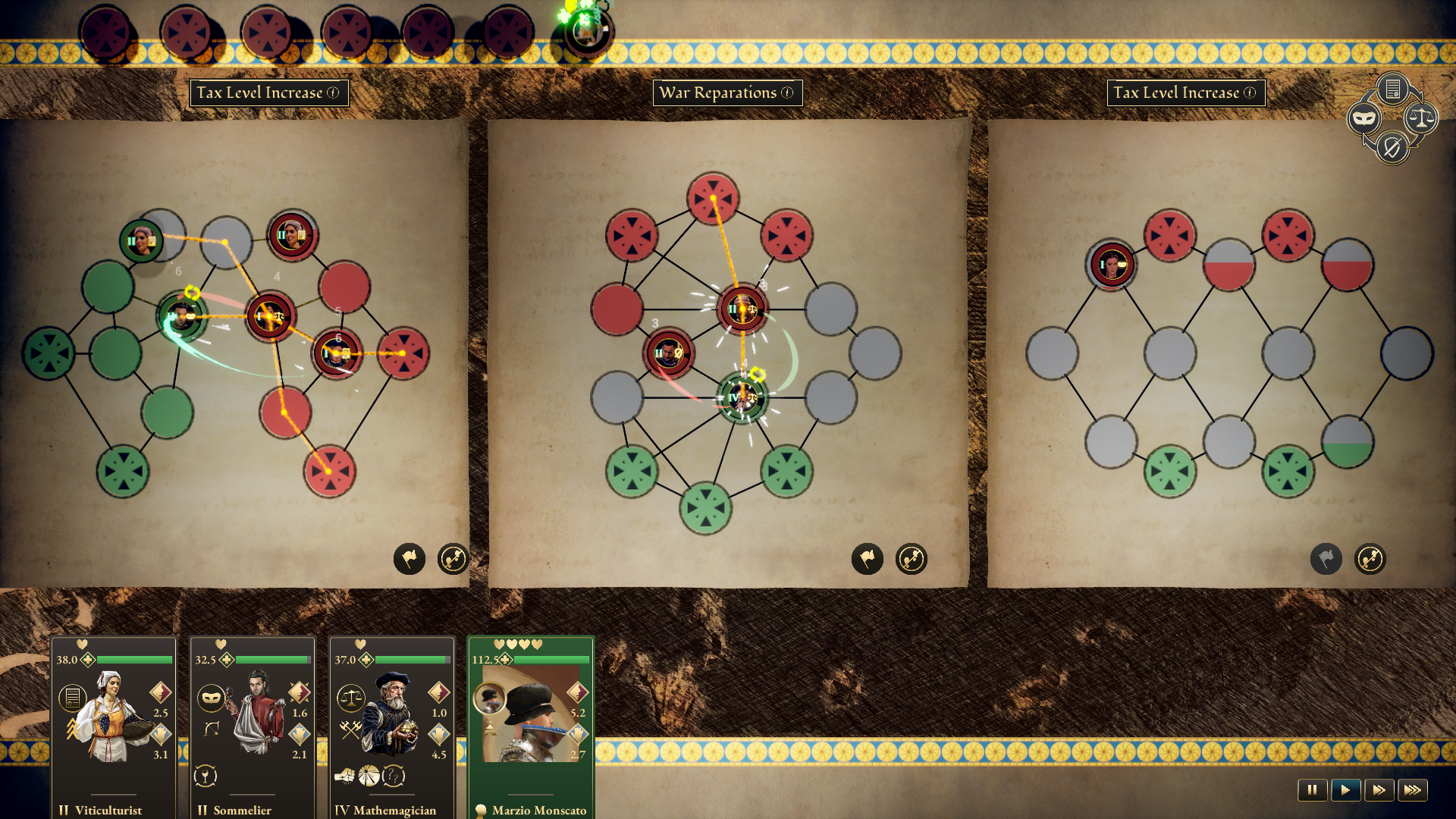 Unlike military battles, where victory might be more straightforward, social conflicts involve negotiation "fields" in the form of [b]boards[/b] where you place your character and companions. The board is made of [b]nodes[/b] and paths that represent [b]verbal sparring[/b] that you must win by conquering the nodes. When characters or companions meet, they argue until one of them backs away. You and AI alike can [b]prioritize specific topics[/b], making negotiations more intricate and goal-oriented. These conflicts can include trade, marriage, and peace negotiations, for instance.