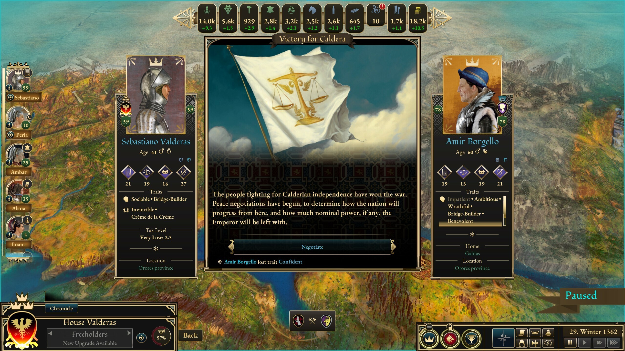 So the Civil War begins, gradually gaining momentum throughout the midgame while all the Houses pick their sides. The Emperor makes a grand entrance into the picture, and we catch glimpses of Calderia's Houses reclaiming their ancestral lands and the forgotten knowledge of the previous civilization. In other words, the Empire embodies medieval times, whereas Calderia inspires to go forward. This dualism now reveals more about where part of the inspiration for the game came from. Europe was transitioning from the Middle Ages to the Renaissance and then the Enlightenment, but when the world is changing, there are progressive forces and regressive forces, those who push for advancement and those who are resisting and in danger of losing something in the process. And all that change usually causes conflicts. While these struggles often arise from within, in Great Houses of Calderia, they are externalized through the entities of the Empire and Emperor.