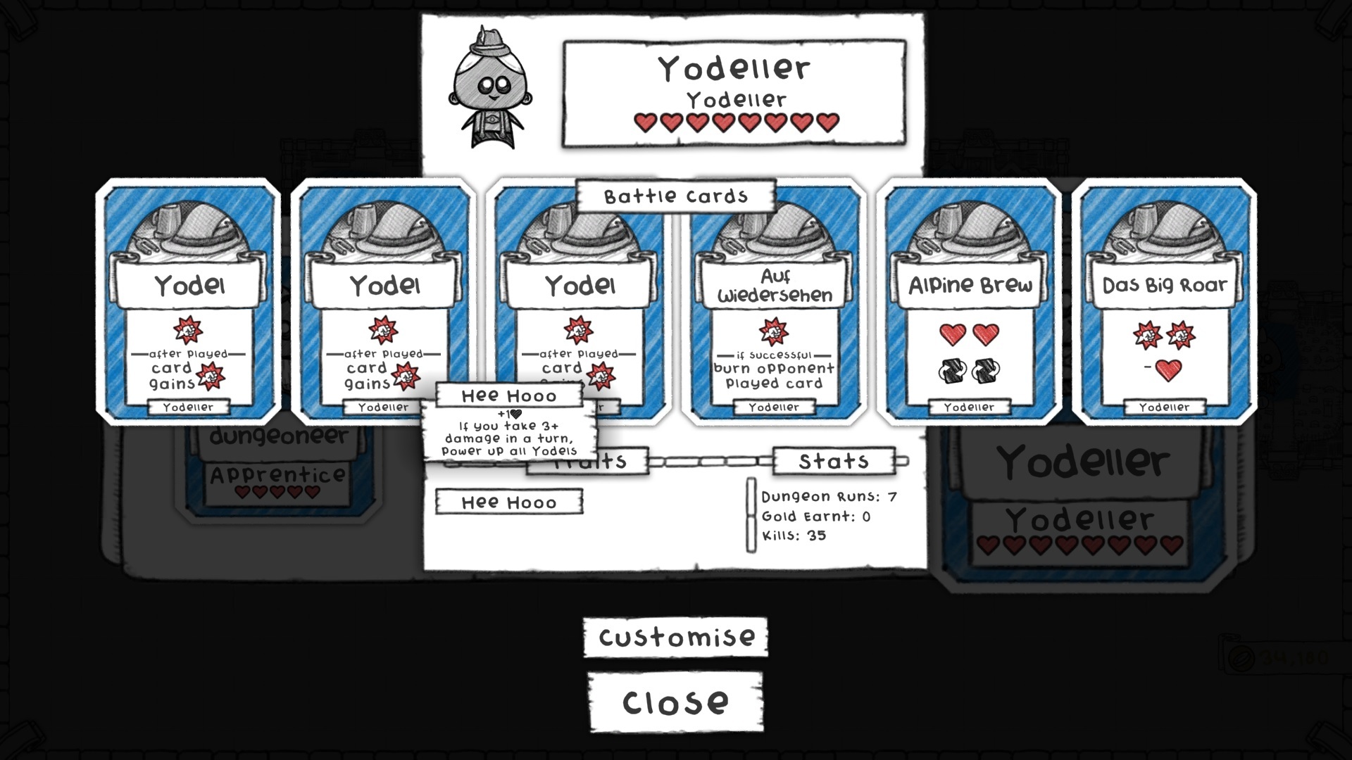 The final reward class from the Ice Cream Headaches area joins you just before you unlock the Jungle and start facing Tier 2 enemies. We gave them a couple buffs to match Tier 2 better. Firstly they get +1 heart and secondly ALL Yodels upgrade every time they take 3 damage (previously only ones in hand did). This makes playing Yodels much more likely to be upgraded ones.