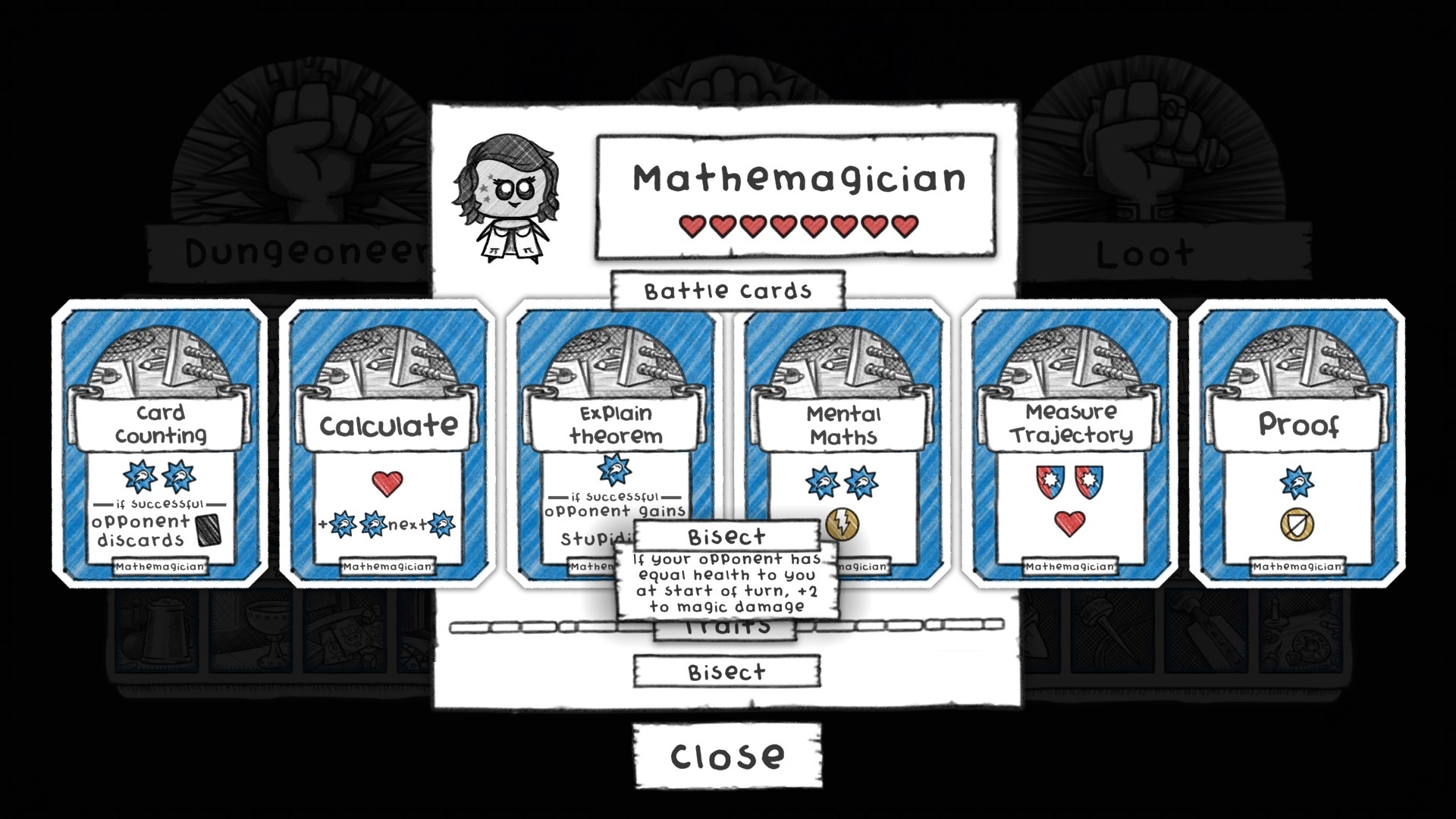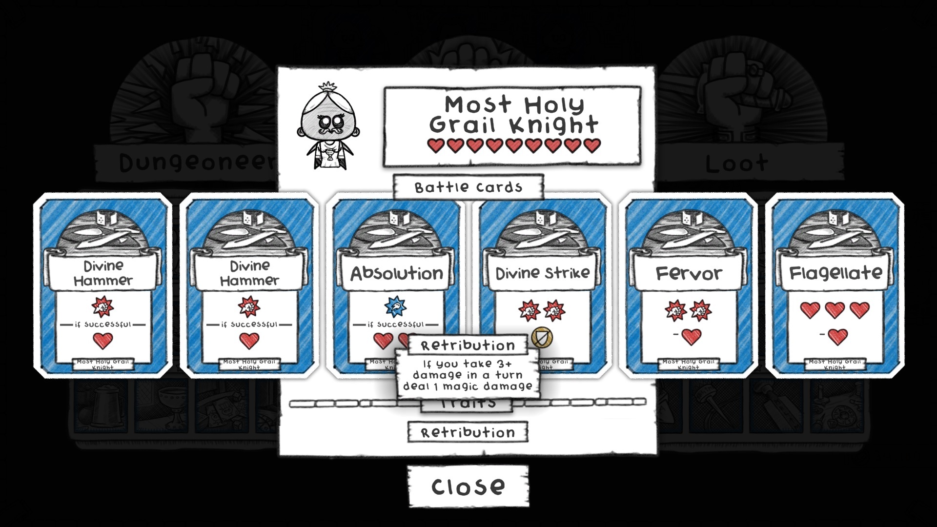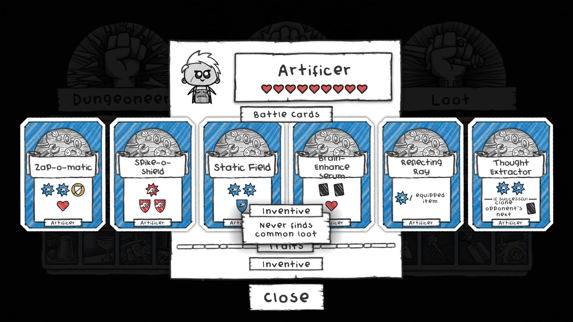 The only class at the end of the loot-unlock tree, it combos nicely with having lots of shiny loot unlocked! We were happy to keep this as is but decided to change one of their cards purely because of all the headaches it caused to our battle code calculations. Reflecting Ray used to do damage based on how much damage you caused, which had all kinds of awkward ramifications with traits, fountains, etc. We changed it to instead deal magic damage based on the number of slots you had equipment in (0-4).