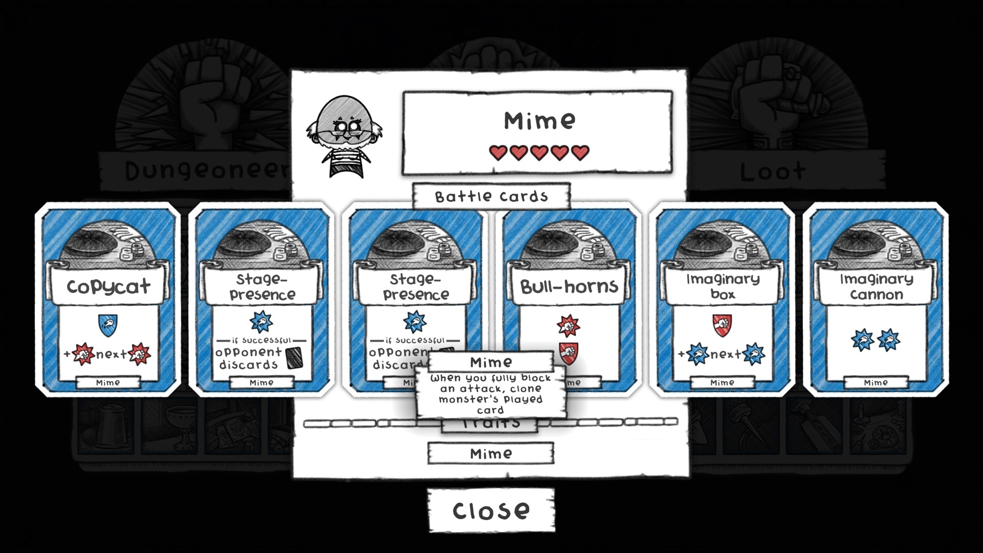 The Mime got a significant change to how it works in Ultimate Edition. Previously the Mime could clone enemy cards via a unique attack card but now they do it via a passive trait. Now instead of needing to hit with a weak attack to then gain a particular card, instead you gain cards naturally through efficient play. The old copycat card has been changed to a mirror image of the imaginary box block card, giving plenty of versatility to the Mime.