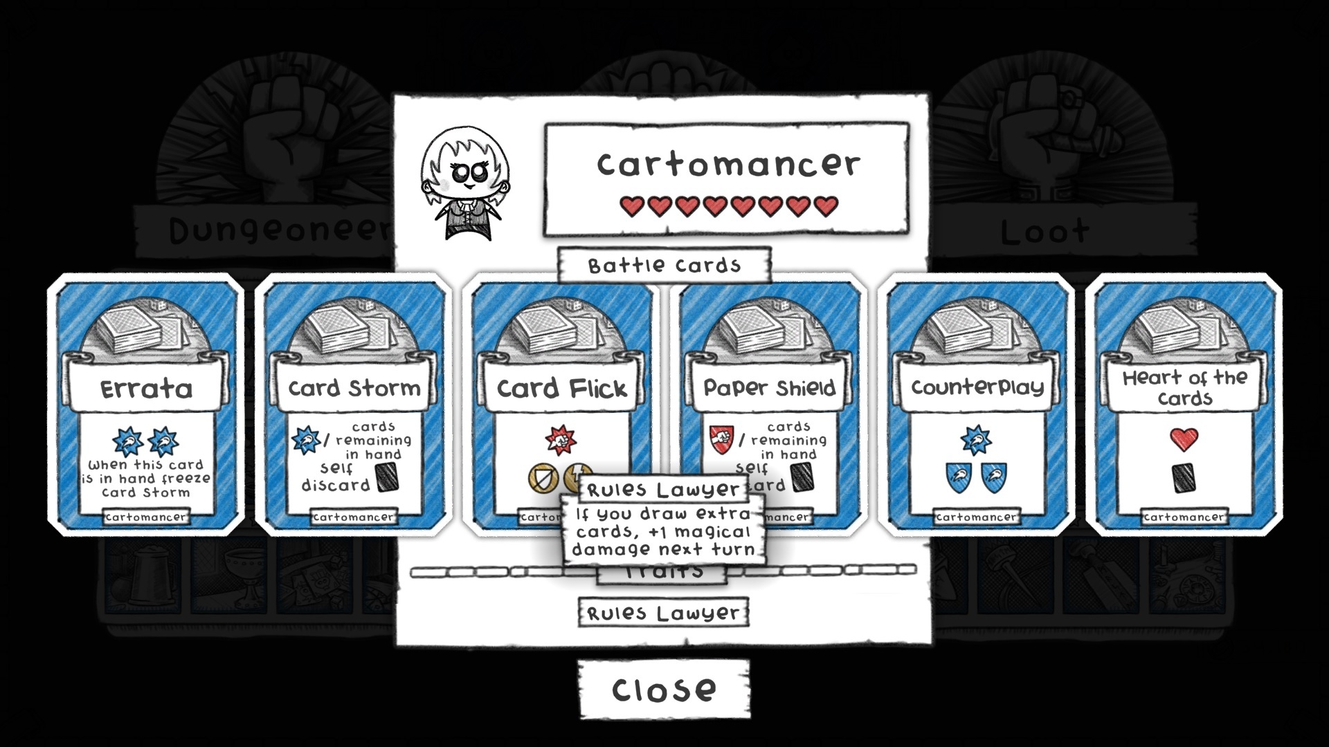 The Cartomancer was undeniably fun to play in Classic, but it had an extremely overpowered combo that made it both unbeatable and a bit autopilot to play. Draw all your cards and one-shot the enemy with Card Storm (bonus combo with Cerebrate from the Arcane skill tree). We changed it around so it is still possible to pull off a one-shot move, but it's a bit harder and you have to pay more attention. Firstly we changed the Rules Lawyer trait from drawing extra cards to instead giving extra magic damage. Secondly we added the Errata card which was previously called 'Original-Edition' and just had 2 plain magic damage. Errata now adds a Freeze effect to your Card Storm if they are both in hand! You need to get rid of Errata to be able to play Card Storm, so it's not possible to draw your entire deck and blast away. Of course there's a few ways to get around having that Errata in hand for canny players (Favour anyone?)... We also made Card Storm's self-discard much less severe, so it's ok to play earlier for less damage, and added a self-discard to Paper Shield (useful to ditch Errata!). Separate to the Cartomancer but related to their combo we changed Cerebrate to heal one less heart.
