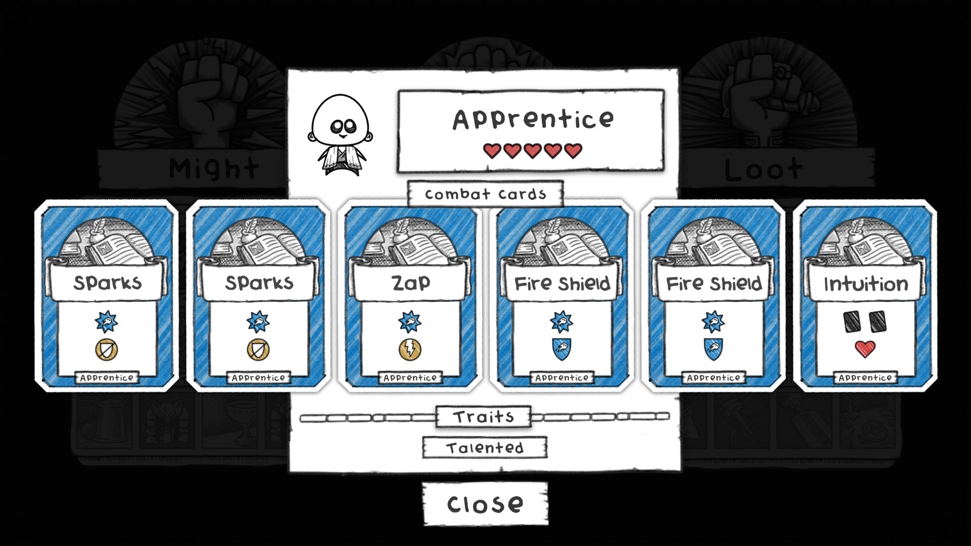 The Apprentice is very specialised with all magic damage and magic blocks. Their Talented trait gives them the first level of the Fire skill so you can very easily get them the more advanced Fire attacks. They do remain vulnerable to physical attacks however. We gave them a small buff by upgrading the Intuition card to include +1 heal as well as the card draw, making it a useful play most of the time.