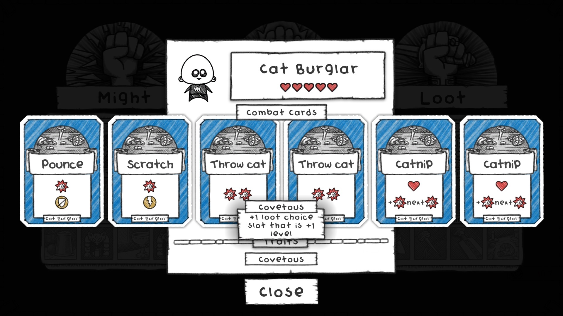 Cat Burglar was a little weak in Guild Classic so we've given them a buff while keeping their design the same: they are purely physical and start with no blocks. All out attack, but weak against certain monsters. Their two Catnip attacks have been given a +1 heal on top of the +1 next damage, so it no longer feels like a 'dead' move. Their trait has also been upgraded so the additional loot choice now comes with a +1 level upgrade. This can help you get better loot earlier in your run.
