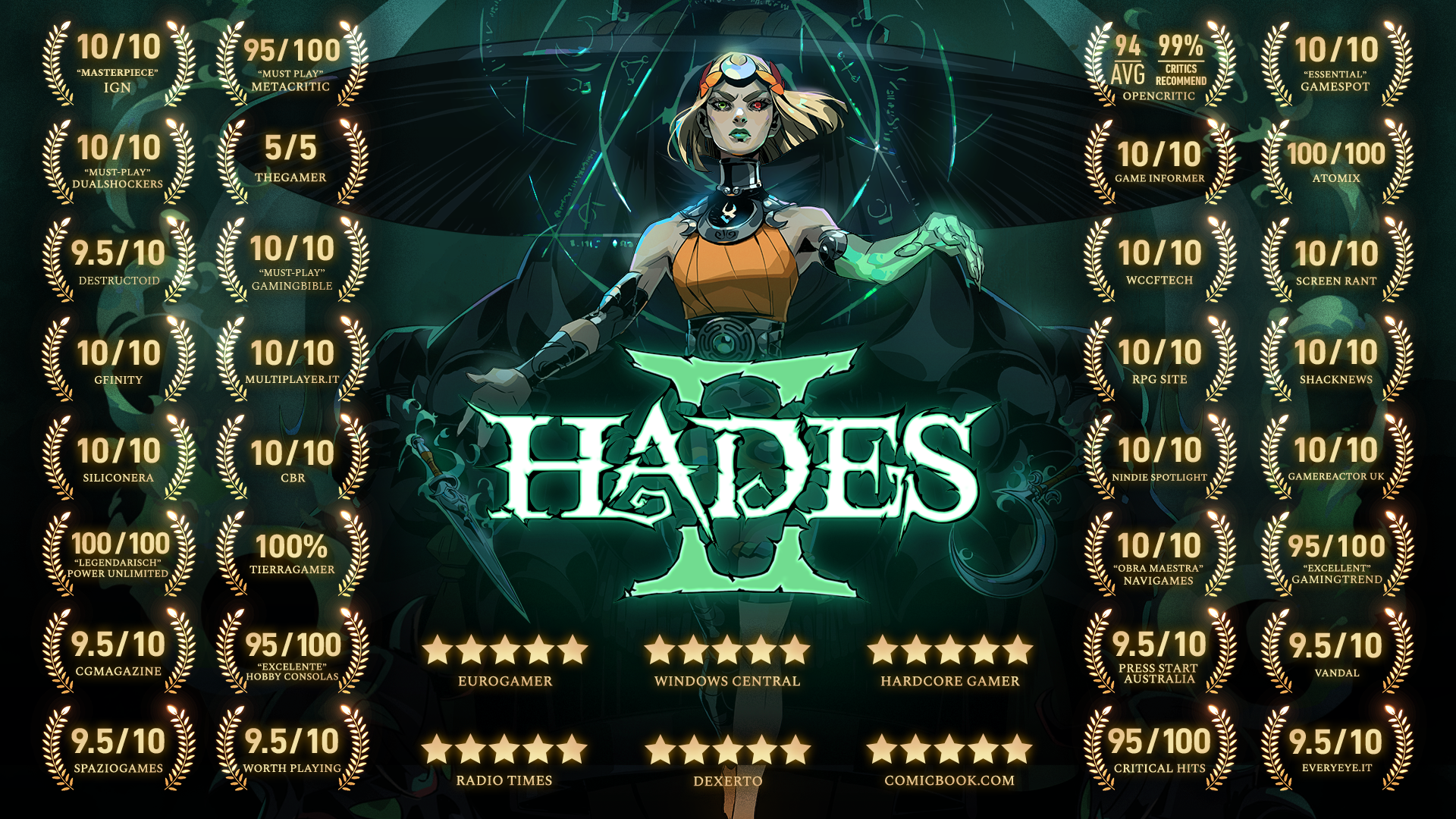Thank you for playing [b]Hades II[/b], which is currently the most critically acclaimed game of the year according to [url=https://www.metacritic.com/browse/game/pc/all/current-year/metascore/?platform=pc&page=1]Metacritic[/url] and [url=https://opencritic.com/browse/all/2025]OpenCritic[/url], and the highest-rated game in our studio's history!