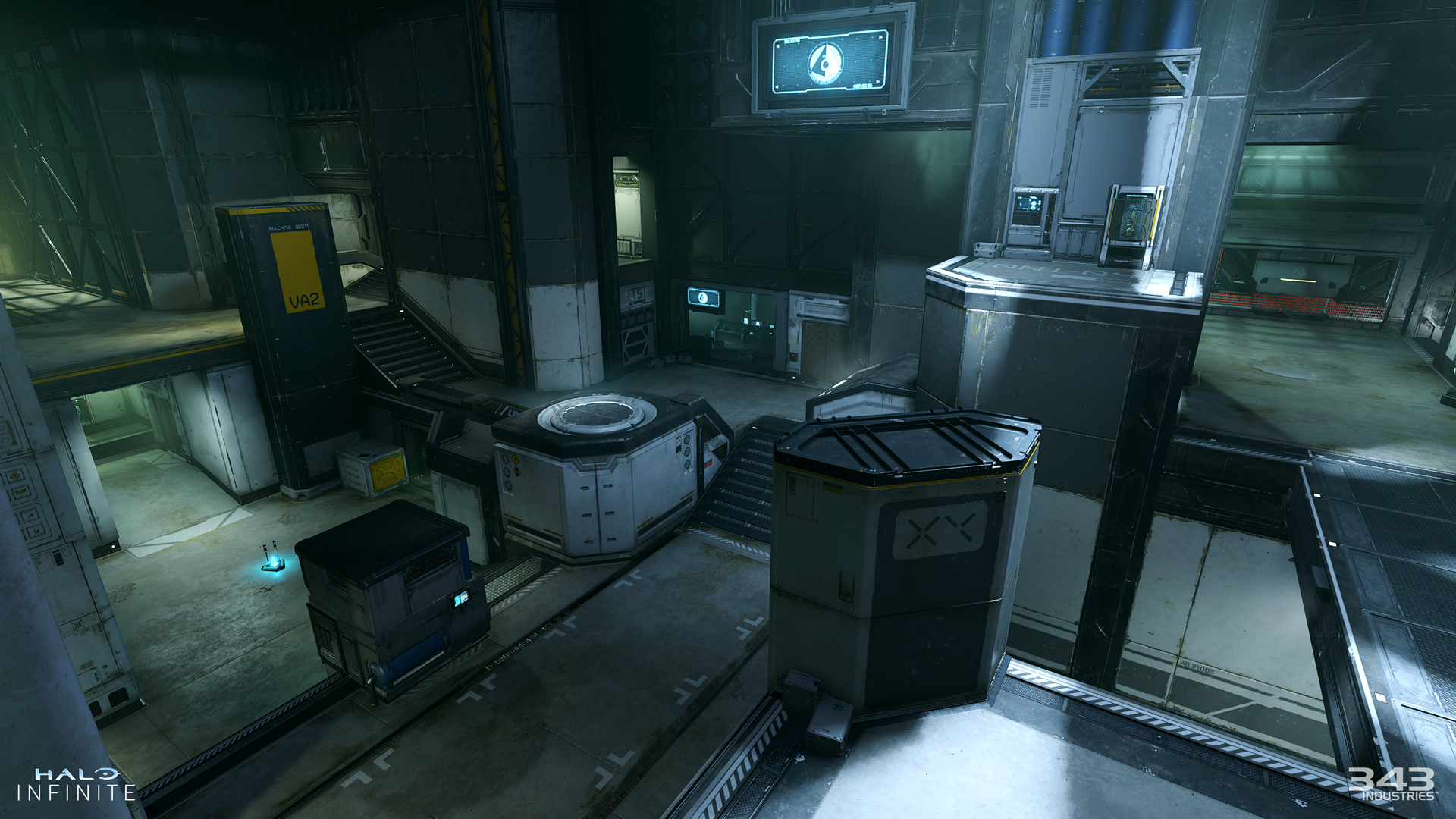 Once we transitioned to the active camo hallway, the lore of the map really grew out of that. On one side of the map, you’ll see an active camo pyramid from [i]Halo: CE[/i] and [i]Halo 2[/i] which is hooked up to still-functioning machinery, a remnant of ONI’s attempts to reverse engineer its effects. On the other side of the map, there’s an overshield cube also hooked up to the ONI machines, but that side is damaged and inactive with error messages.