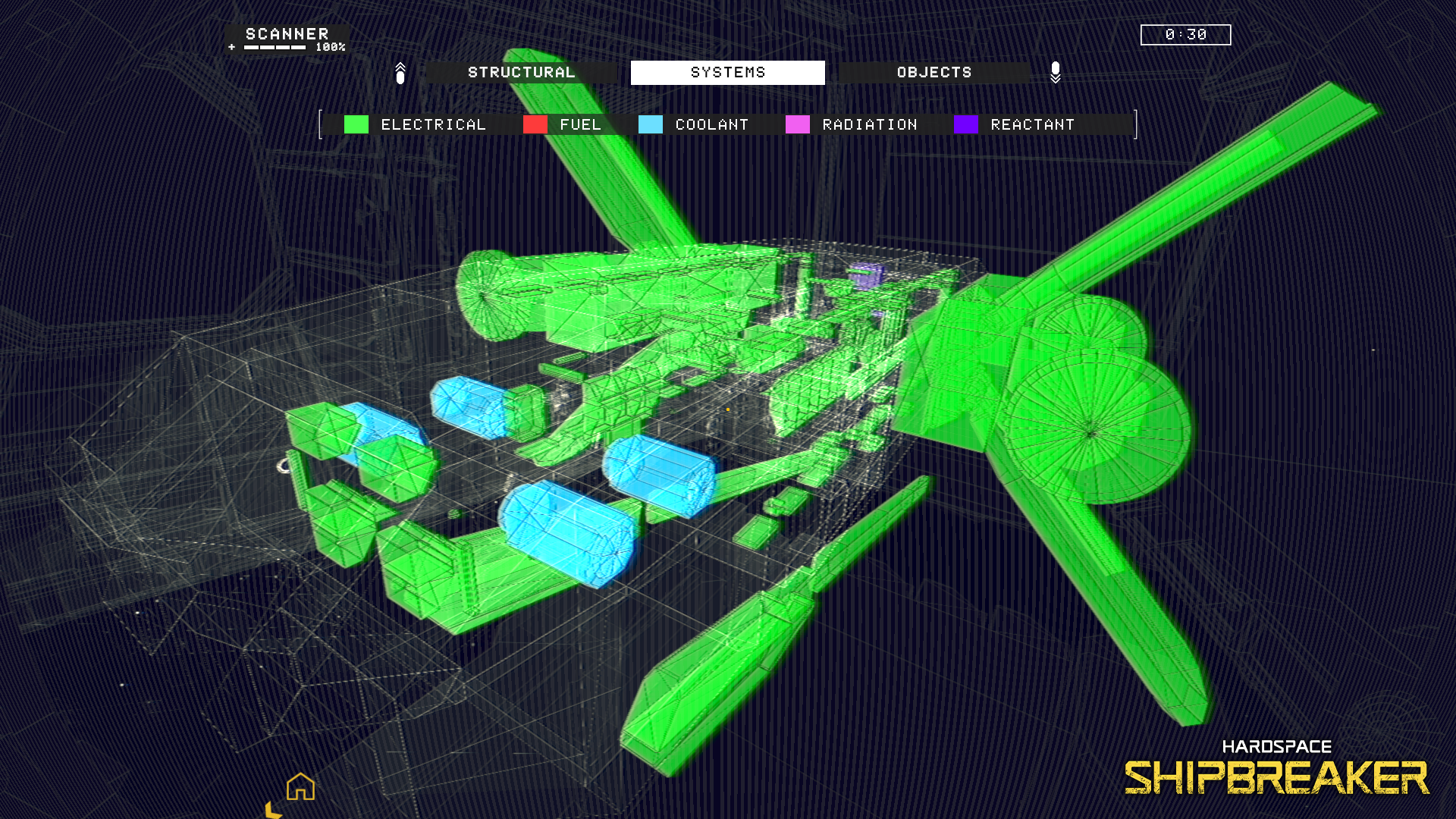 [b]All Scan Modes have been updated[/b] with the goal of improving clarity and readability. [b]Power now works more logically in ships[/b]; if an electrical object has lost its power supply, it will no longer be hazardous when salvaged or damaged. [b]Reactors are now immune to fire and electrical damage[/b], mitigating runaway catastrophic meltdowns that can eradicate a ship’s-worth of salvage in the blink of an eye. [b]Tools can be repaired quickly[/b] in the HAB without needing to open the submenu for each tool.