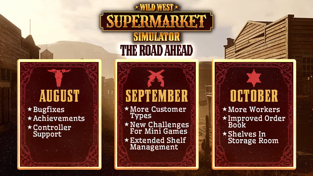 The next things we will focus on, are improving the game and [b]fix any bugs[/b] that may come up, as well as add [b]achievements[/b] and [b]controller support[/b]. We've also planned to add more [b]types of customers[/b], [b]new challenges for minigames[/b] and [b]extend the shelf management[/b]. And, Wild West Supermarket Simulator will get [b]more workers[/b] to hire, an [b]improved order book[/b] and [b]shelves for the storage room[/b].