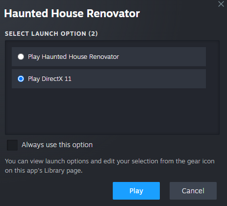 Today, we’re bringing you a long-awaited update, we've added [b]experimental support for DX11[/b]! ????️ We know many of you have been waiting for this, and we're happy to finally let you test it out. However, please note that this is an experimental version of the game, launched separately from the Steam client. It will look different and may have issues not present in the DirectX 12 version of the game. That's why we are not changing our official system requirements listed on Steam – DirectX 12 is still required, as this is the DirectX version we can fully support. Here's how it works: When launching Haunted House Renovator, you'll now see two launch options:- The top option launches the game with DirectX 12: this is the recommended and supported version.