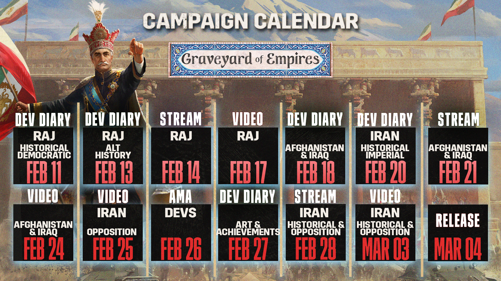 Today we’re really excited to introduce you all to our latest country pack, [i][b]Graveyard of Empires[/b][/i]. Over the coming weeks, we will have a number of developer diaries showcasing the latest countries receiving new or updated focus trees. We will also have a number of streams so you can really get to grips with what to expect of all the latest content and we shall also be doing an AMA with the developer team. Have a look at what’s coming: