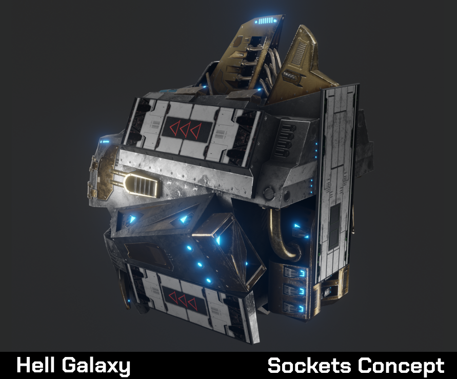 For in-game implementation, we aimed to keep the shapes of the sockets simple and universal, as each module serves a distinct purpose. Using square shapes as the base ensured they were instantly identifiable while supporting a system that works seamlessly across all modules. This approach allowed us to design compact ships where the hull naturally integrates with the modules, creating a unified yet visually distinct look.