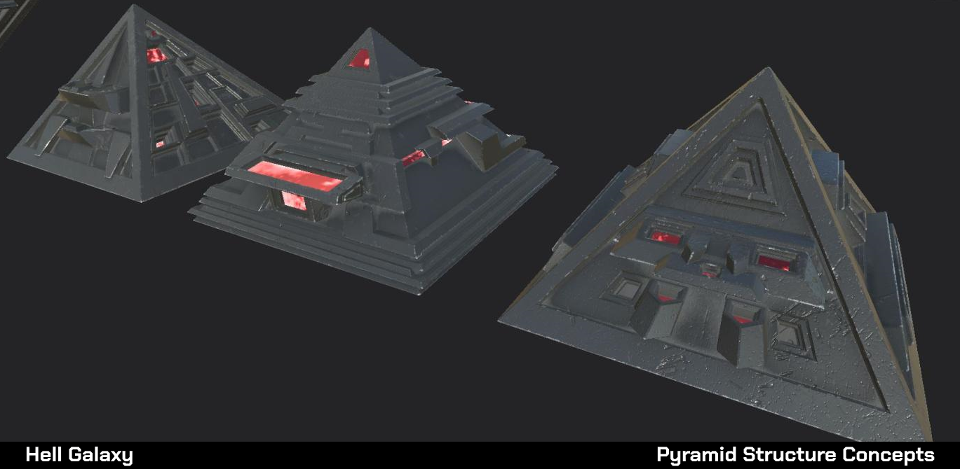 We spent a lot of time refining the placement of the pockets, exploring various concepts to find the most efficient and visually compelling arrangement. Initially, we experimented with pyramids that resembled real-world monuments, featuring intricate reliefs and heavy ornamentation. Our original idea was to make these structures feel more like ancient monuments, as you can see from these early concepts.