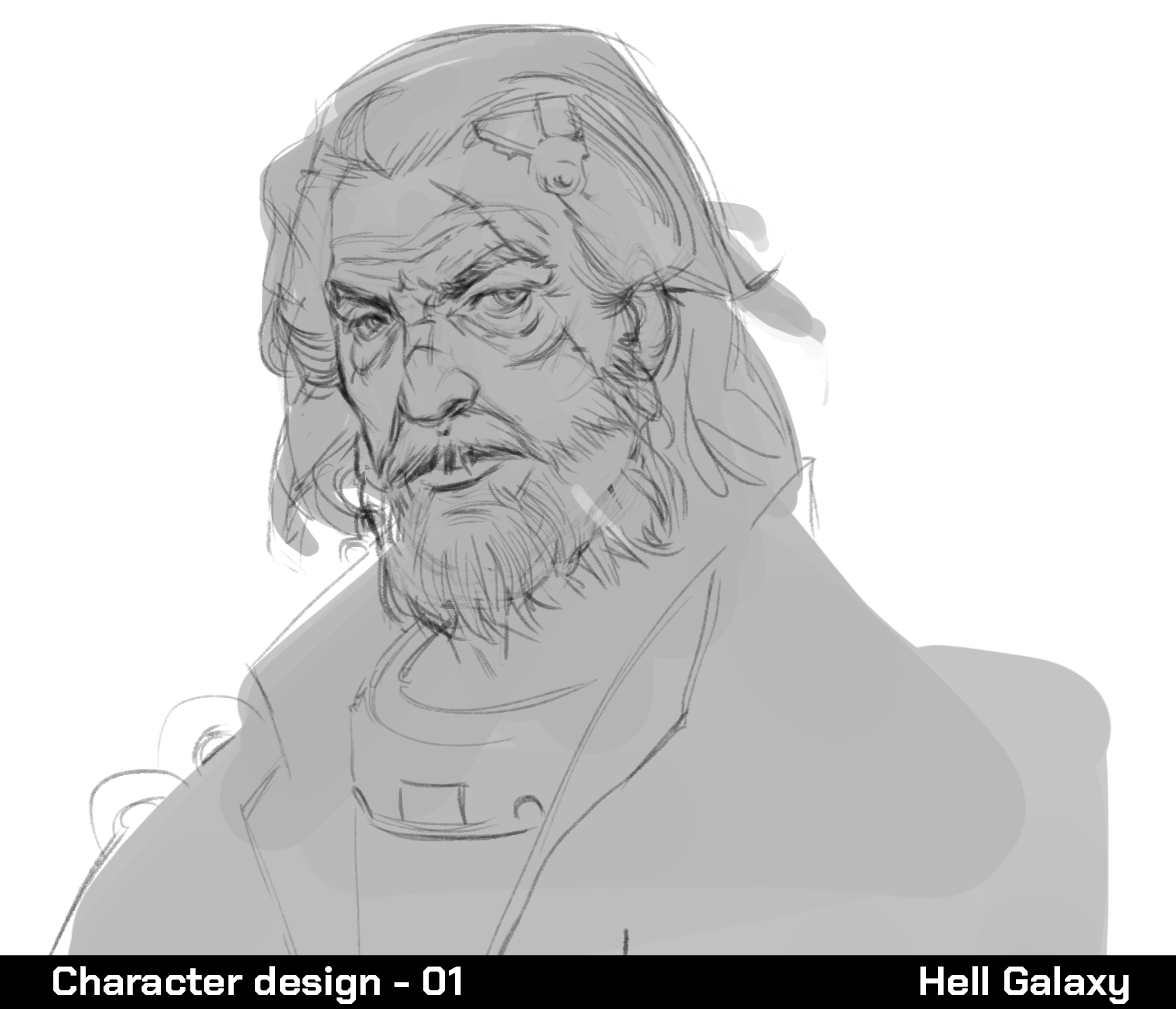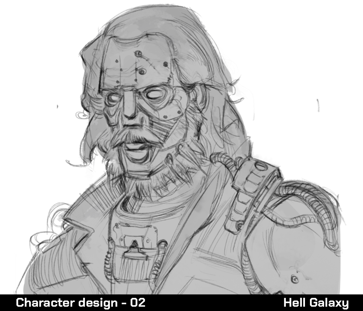 In the process of creating a raider, after building their narrative, we start making sketches before finalizing the design. We won’t reveal too much about Old Joe since you'll meet him in the final version of the game, but we’ll use him as an example to illustrate our creation process. We started with a design, exploring a "death mask" direction. We imagined Old Joe’s corpse without his consciousness, with his face covered.