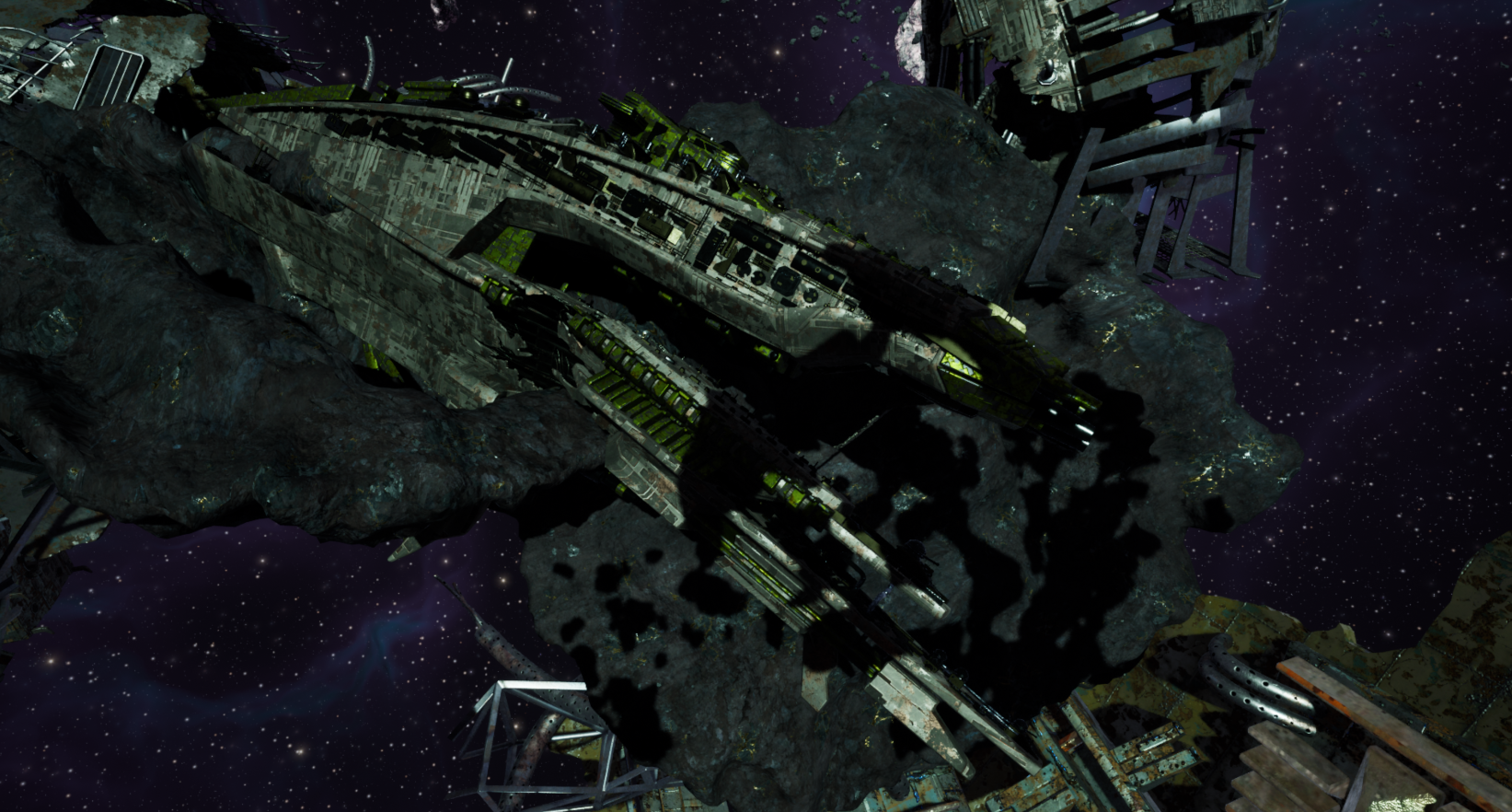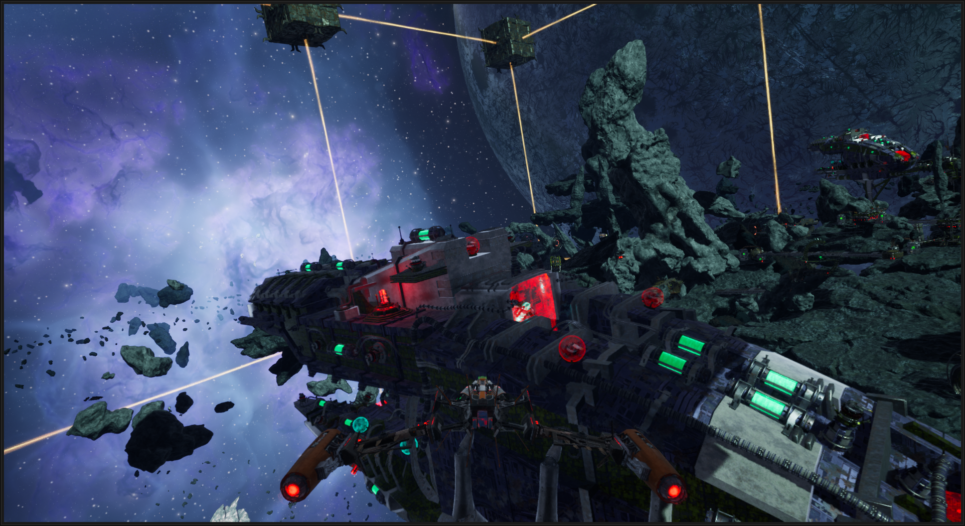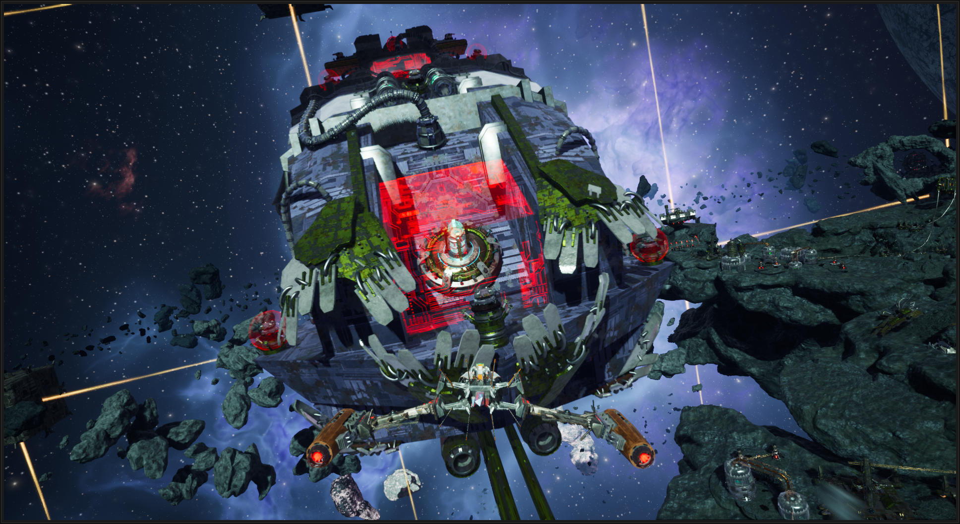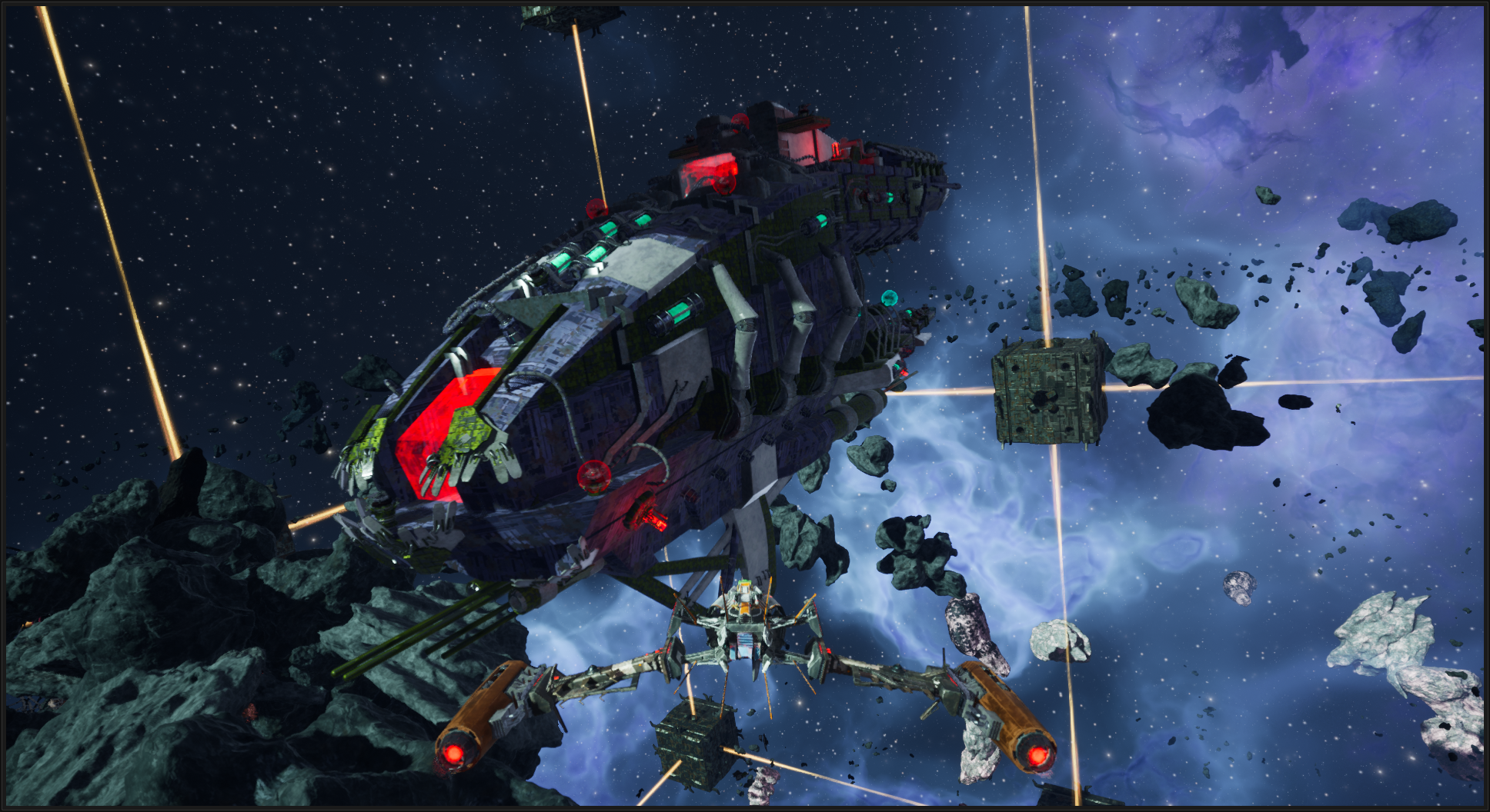 Old Joe has managed to create an entire fleet of capital ships, each one controlled by fragments of his own brainwaves. This allows him to operate multiple ships at once. We also wanted to convey the idea of Old Joe as a raider who has fought countless battles across the Neterun colonies, so don’t be surprised if you come across the wreckage of his ships scattered throughout the galaxy.