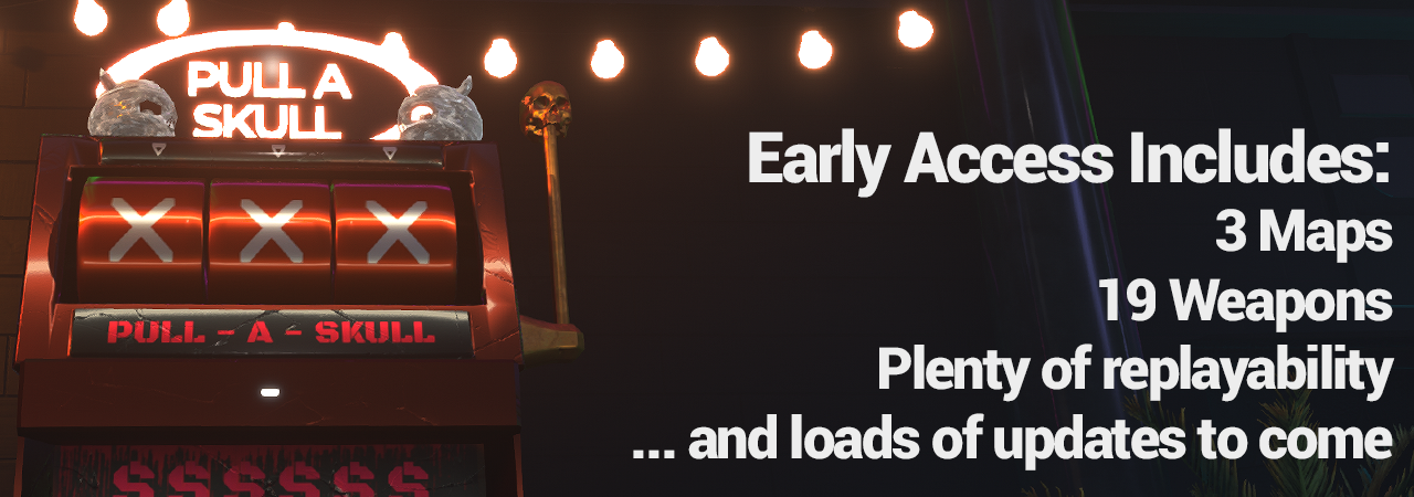 The wave-based First-Person Shooter, [b]single-handedly developed by Ashley Ellis[/b], will launch with an offline mode (single player) and the multiplayer mode you’ve grown to love. Join the action-packed chaos with 1-4 players! [b]Set your loadout, kill, and earn cash. Take a spin on the various slot machines and level up to improve your survival chances.[/b] With multiple maps to explore, 19 weapons to choose from, and a multitude of different perks to unlock, the challenge of staying alive will constantly double down. Early Access kicks off with [b]3 maps, 3 game modes, and a variety of weapons to master[/b]. Plus, don't miss the [b]final playtest from February 21st to 26th[/b] through the Steam Playtest function.