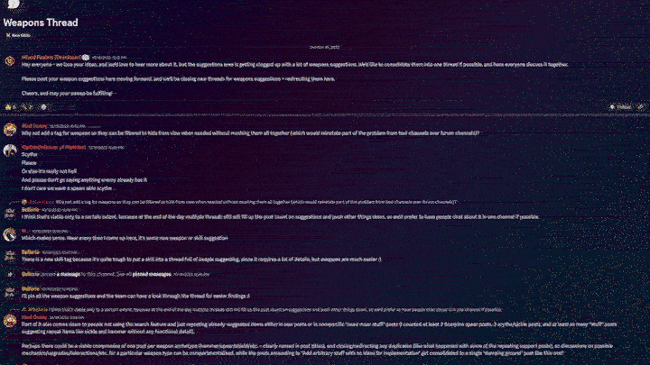 We’ve rounded up all the amazing weapon suggestions we received from [url=https://discord.gg/smjZpHZ3sY]Discord[/url] and shortlisted the ones that align with the game’s current mechanics and our production schedule.
