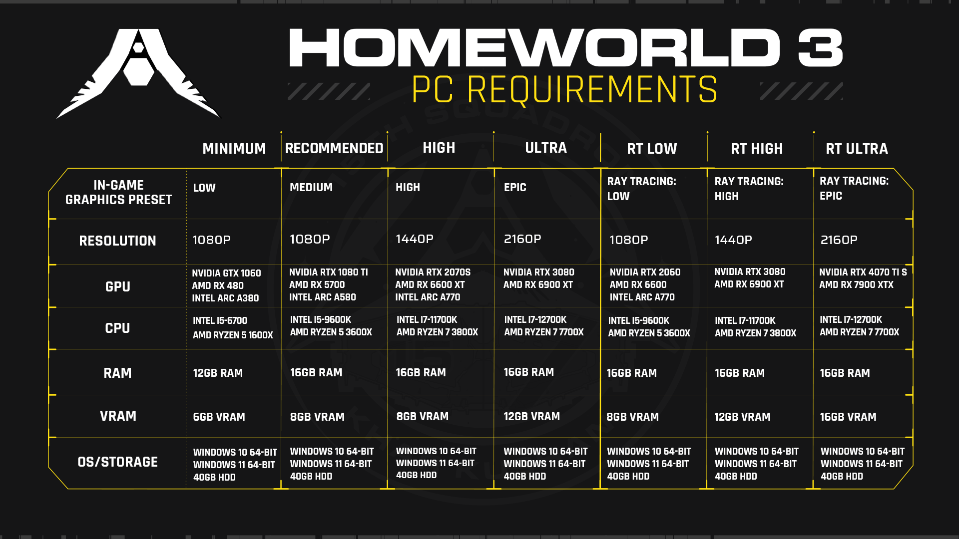 On the road to launch the team has [url=https://store.steampowered.com/news/app/1840080?emclan=103582791471145294&emgid=4145073329281827771]continued to improve [i]Homeworld 3[/i][/url], some of those improvements include further optimization to performance and gameplay. As a result, we have lowered the recommended specs. Now, we'd like to present the most current recommended PC specs for [i]Homeworld 3[/i] when it launches on [b]May 13[/b]!