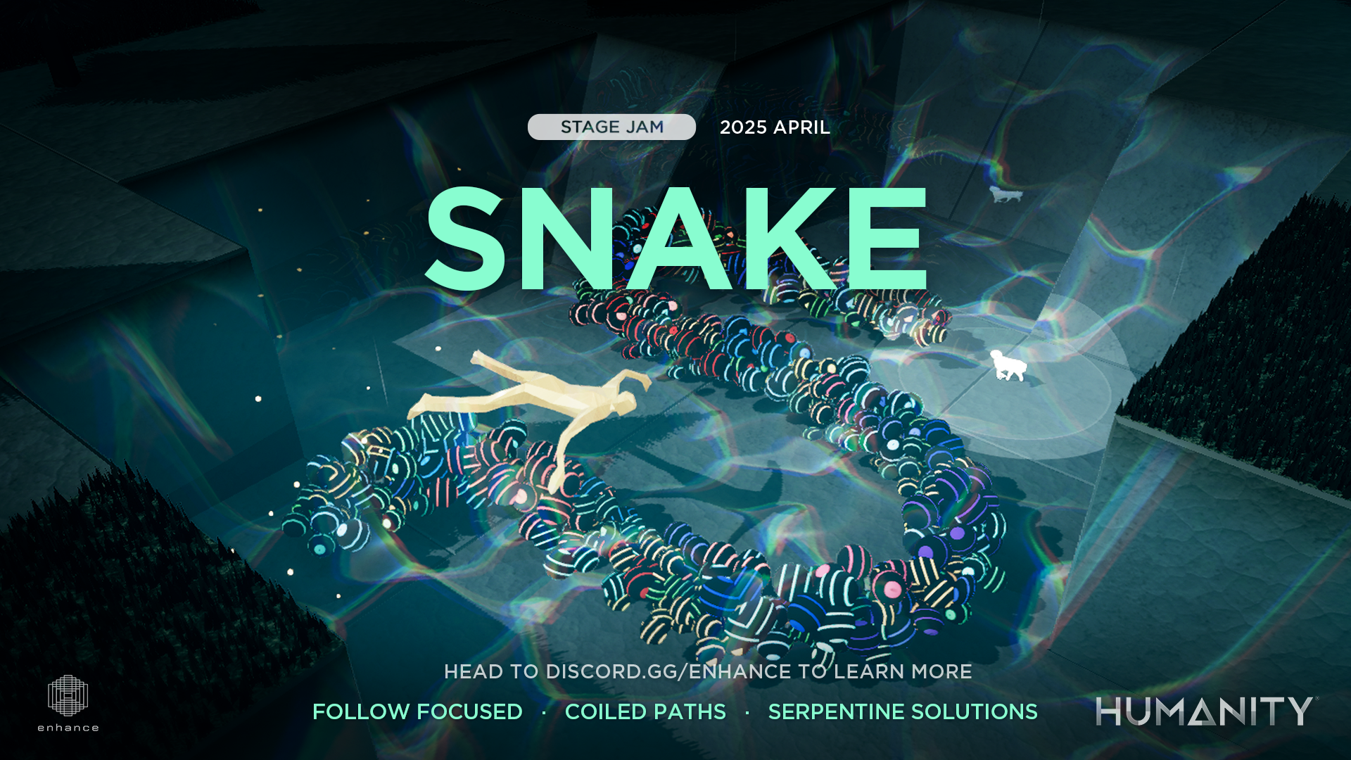 HUMANITY Stage Jams invite our expanding community of USER STAGES designers to craft new levels based on a central theme. For April 2025, the theme is SNAKE, focused on using the Follow command to lead lengthy lines of humans through puzzle challenges. Maybe it’s reinterpreting the classic “Snake” game mechanics, using a long line of humans to activate switches, or coiling your people onto small motorized platforms. But you can take this theme in any direction you want! Stage creators of all skill levels are welcome to participate, and if you’re just a player—keep your eyes peeled for a STAGE JAM playlist within USER STAGES highlighting stages made as part of the theme!
