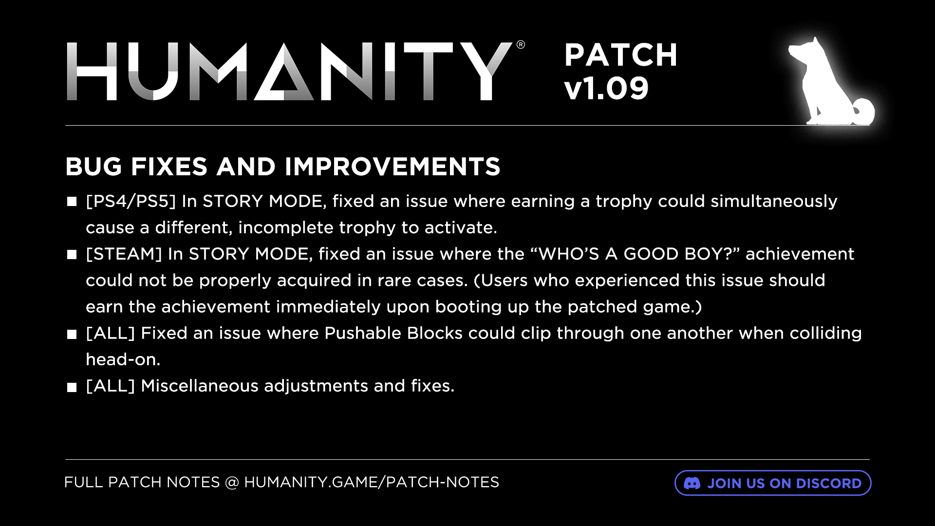 - [STEAM] In STORY MODE, fixed an issue where the “WHO’S A GOOD BOY?” achievement could not be properly acquired in rare cases. (Users who experienced this issue should earn the achievement immediately upon booting up the patched game.)
