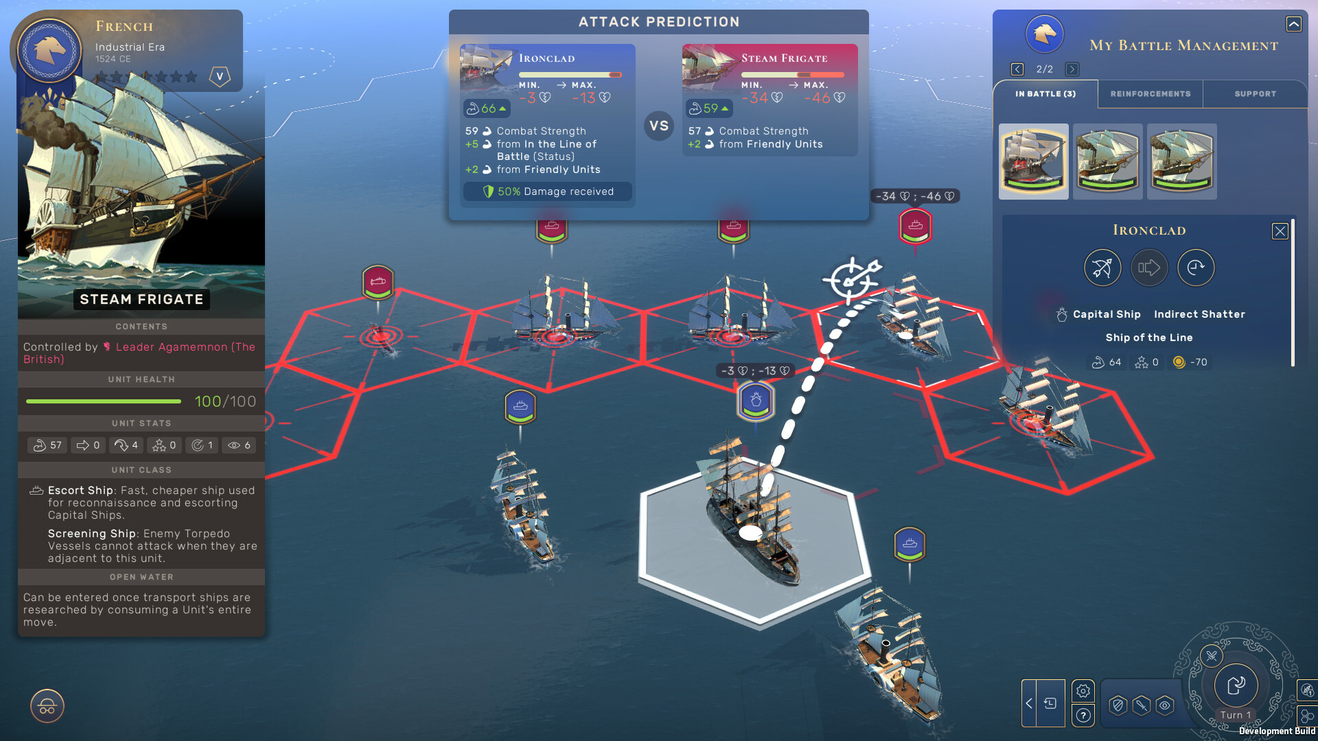 With faster speeds and longer ranges, the combat areas were starting to feel a bit cramped. We increased the size of naval battles to let you take full advantage of the new-found mobility and firepower of your navies, and stretched the deployment zones to the edges of the battlefield to begin every battle in the most favorable position. Finally, these battles will not feature a flag to capture, as a supply camp made little sense on the open seas. That does not mean all battles end in complete destruction, though, as in the second turn of a battle you may be able to call a retreat and fall back to the edges of the battlefield if you have taken heavy losses.