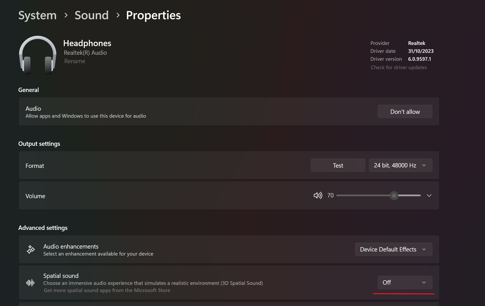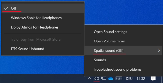 - Select “Spatial sound” and set it to “Off”