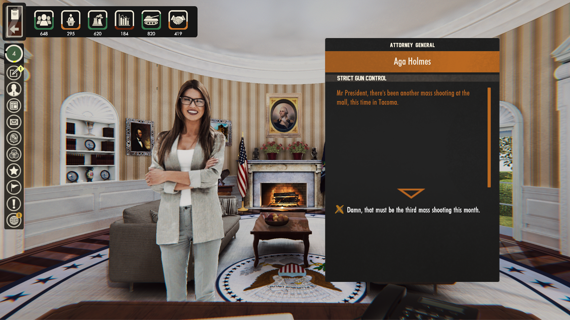 [*] [b]Additional dialogues[/b] - conversations in the White House revolve around the current events and plans, and we want the game to reflect that. Adding new dialogues will be another way of freshening up the game, so your subordinates will talk to you about events, which you may know from the last few years.