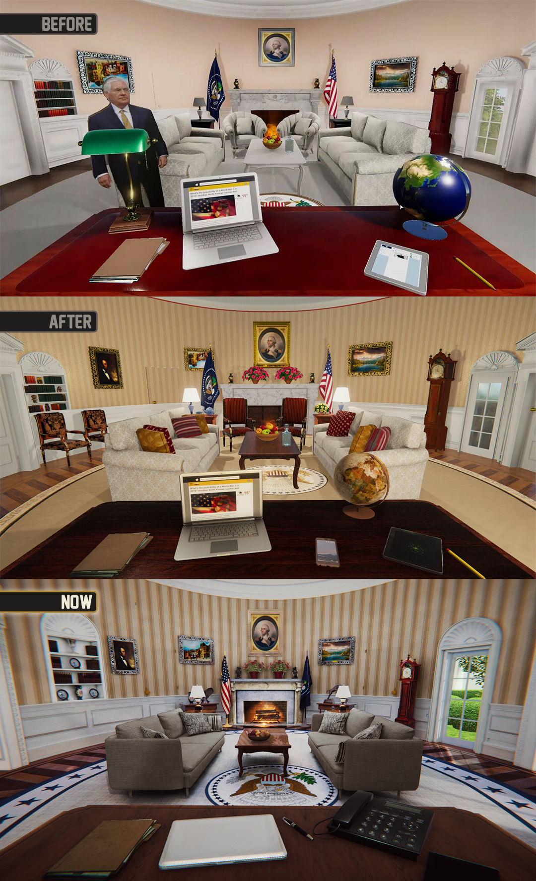 The Oval Office doesn’t look like a mix of random assets anymore. We fixed the horrible lighting and installed new furniture. On top of that, we added a brand new set, which will be a part of the overall experience, so have fun in the Air Force One.