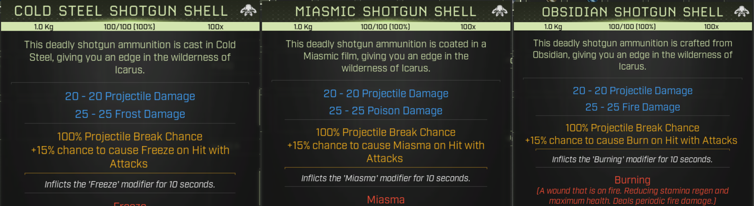Three new types of Shotgun Ammo have been added to Icarus. These are Cold Steel, Miasmic and Obsidian variations, and all are exclusive to New Frontiers, as their required materials are only found on Prometheus. Cold Steel Shotgun Shells have a 20-25 Projectile Damage with a 25 Frost Damage addition, along with a 15% chance to inflict the ‘Freeze’ modifier that reduces movement speed and melee damage. Miasmic Shotgun Shells have a 20 Projectile Damage with a 25 Poison Damage addition, along with a 15% chance to inflict the ‘Miasma’ modifier that lowers physical resistance by 25% for all afflicted. Finally, the Obsidian Shotgun Shell has a 20 Projectile Damage with a 25 Fire Damage addition, along with a 15% chance to inflict the ‘Burn’ modifier that causes -50% health regeneration and -25% maximum health while active. All three of these ammo types can be crafted on the Machining Bench at Tier 3, and require their namesake material which can only be found in Prometheus.