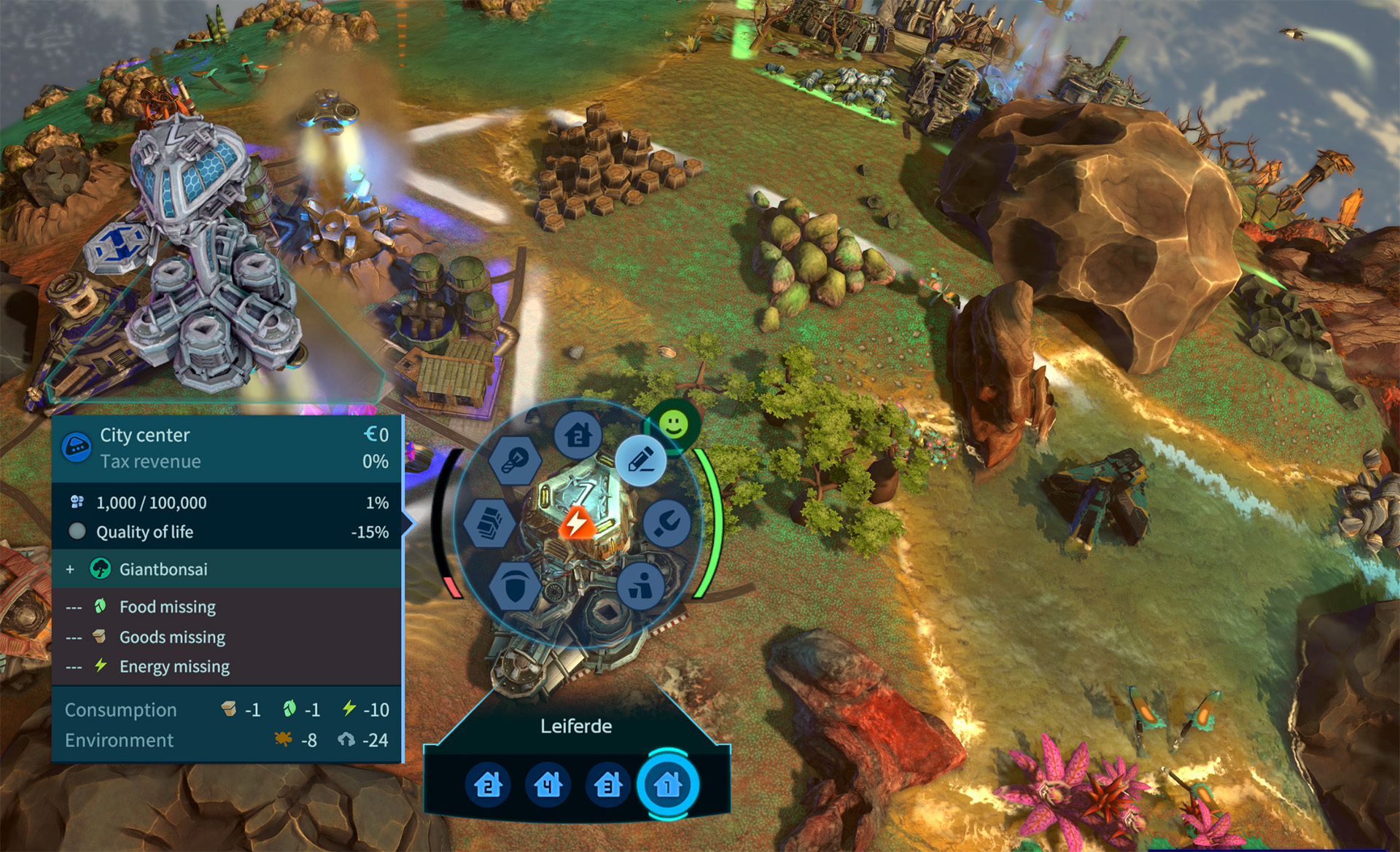 Fossil power plants can now drill and exploit deposits in adjacent fields. This keeps them productive longer and means they need to be moved less often. In exchange, fossil production buildings have again received a malus. It no longer looks in the game as if there would be no problem at all if a certain resource is not available. This is especially important in the context of the core message of the game. Fossil buildings that just keep on working, that too is unrealistic.The new taskbar