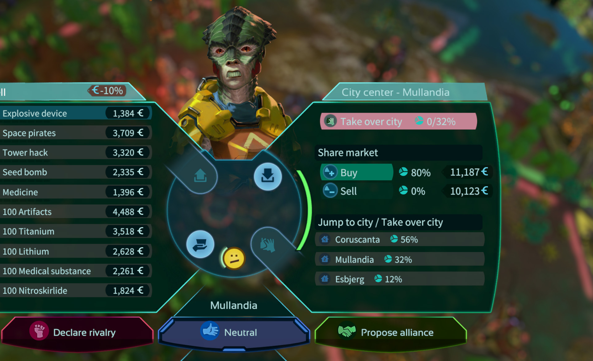 A separate stock panel right at the frasction panel, where you can see all the information about a company's cities and directly buy shares and take over cities. A big button that flashes visibly and visualizes the takeover process.