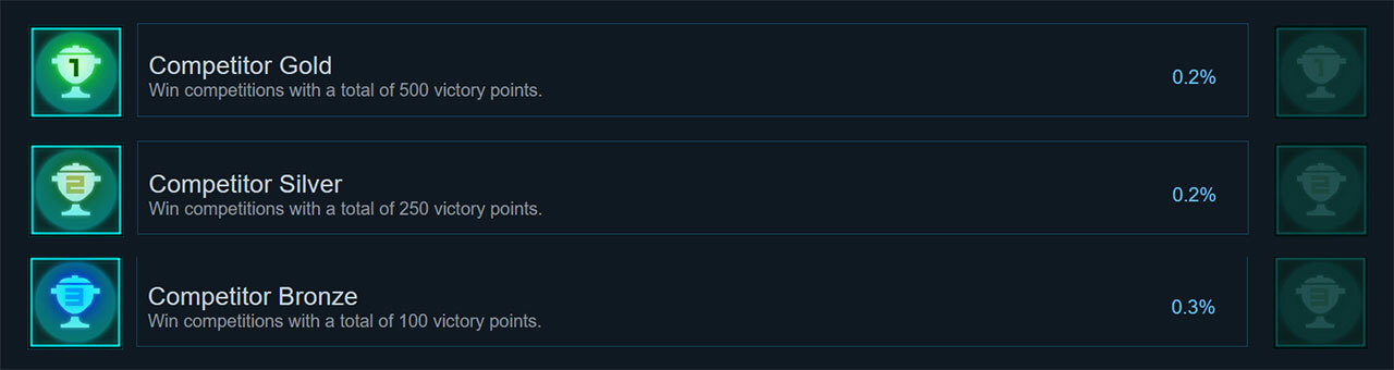 - We have decided to significantly lower the requirements for the competitive achievements down to 50, 100 and 200 victory points achieved in competitions and the weekly challenge. As a result, you may simply have already completed certain objectives the next time you restart the game.